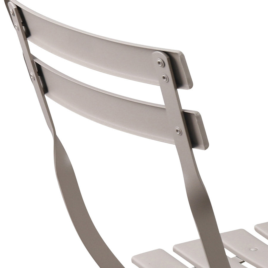 Le due sedie da giardino con schienale e seduta effetto doghe presentano una linea delicata che trova il suo abbinamento perfetto con la linea morbida del tavolino rotondo.