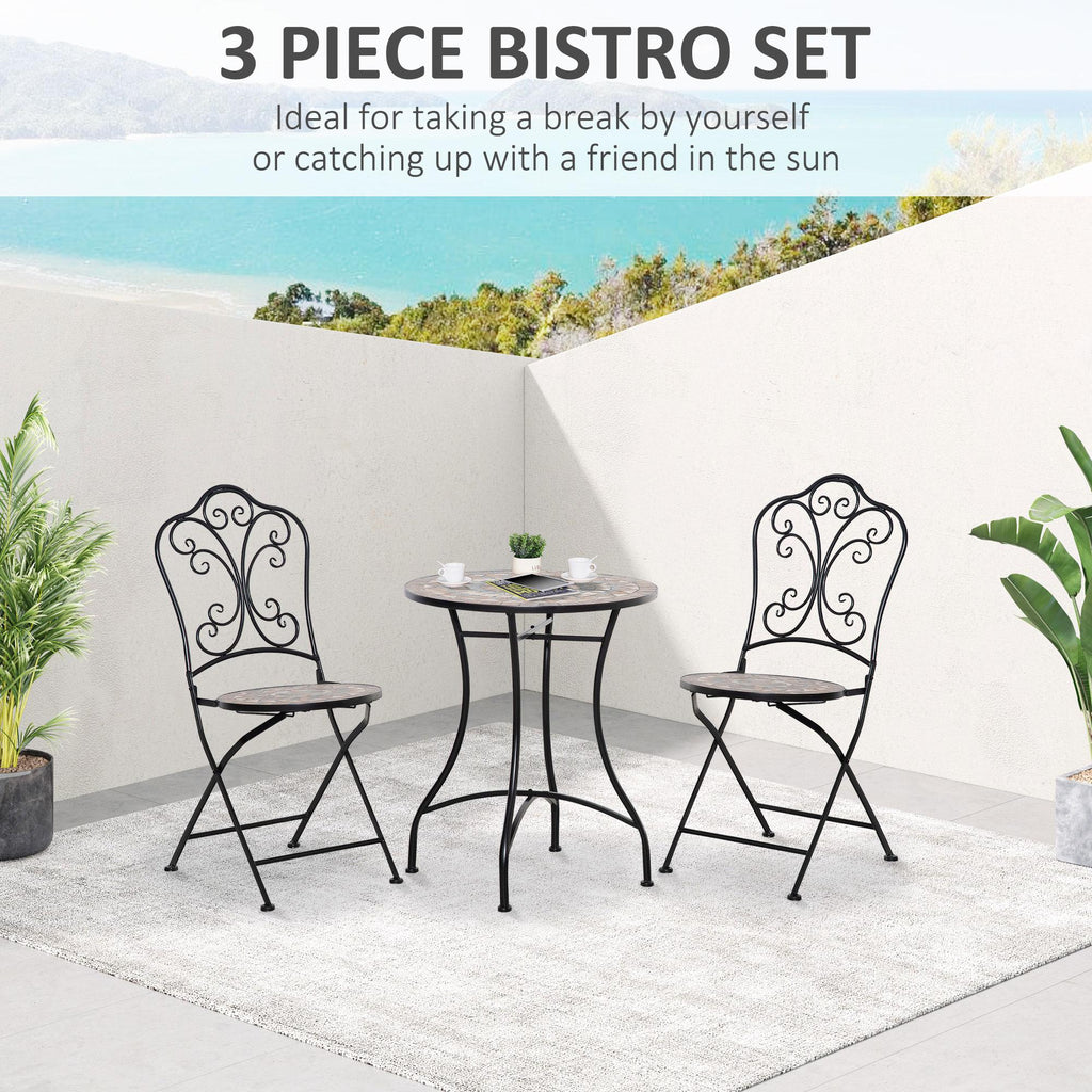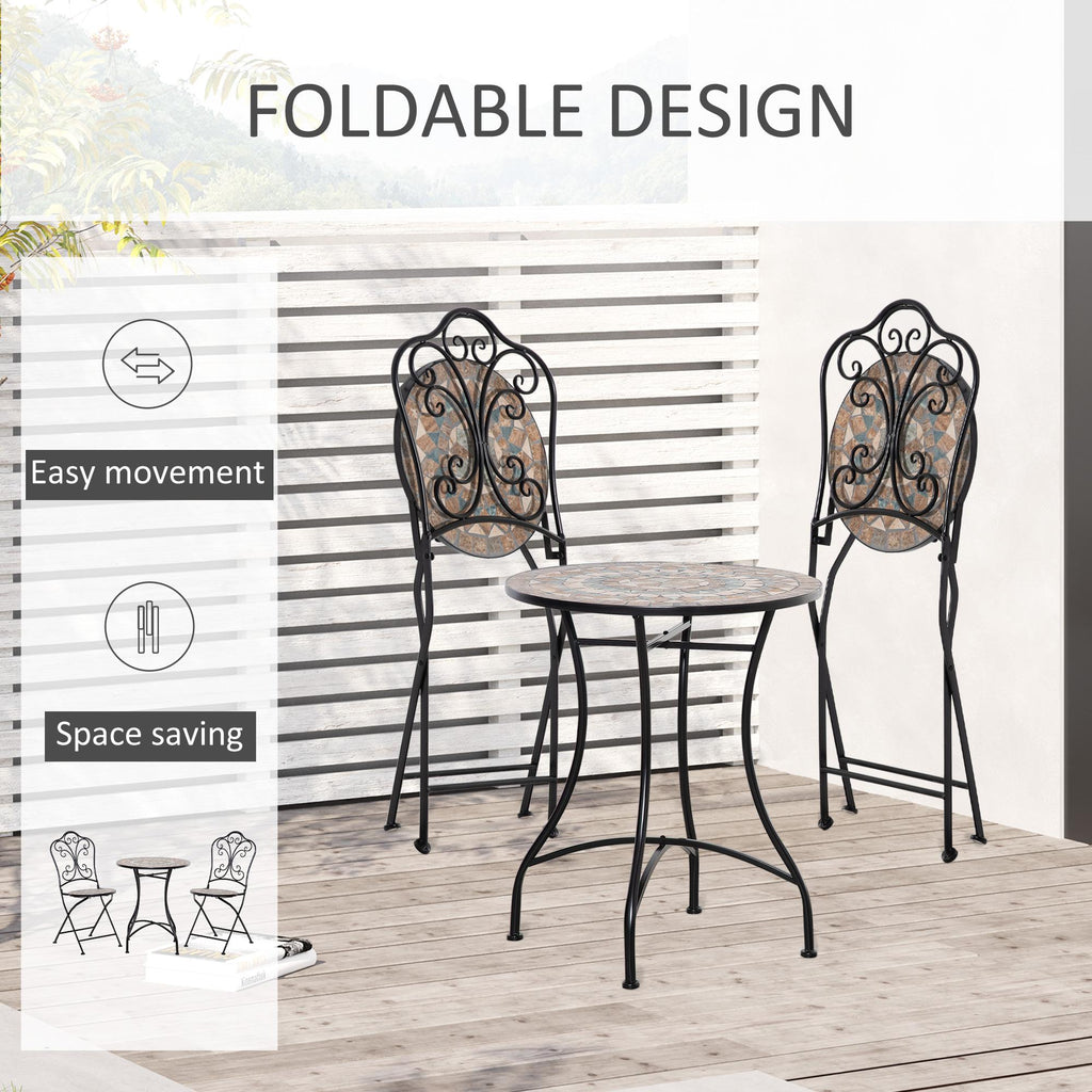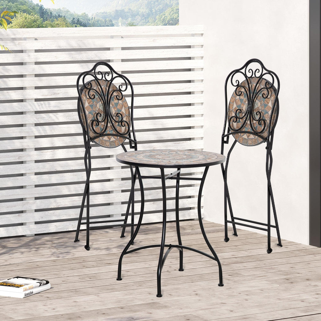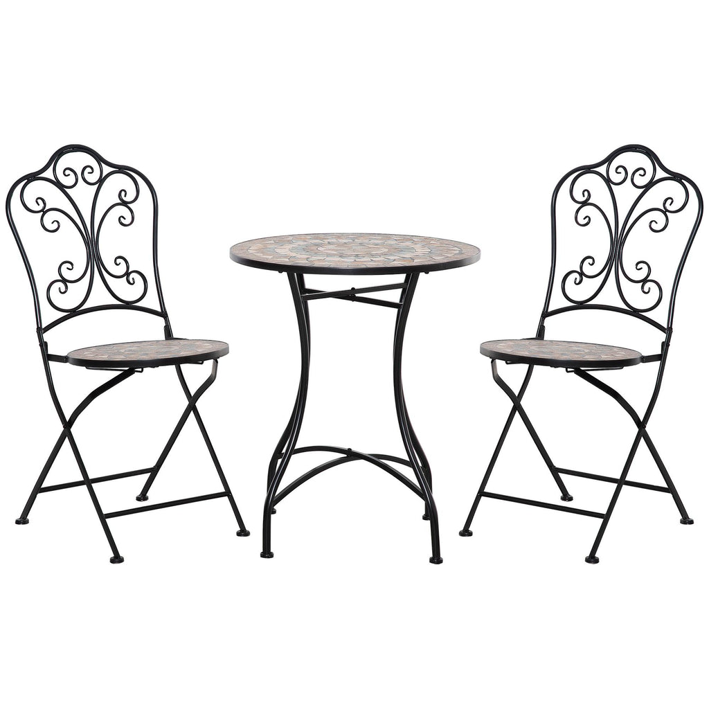Cet ensemble de salon de jardin 3 pièces de est votre solution idéale pour passer votre temps libre à l'extérieur. Le design unique des carreaux de céramique apporte une touche romantique à votre terrasse, jardin, balcon ou partout où vous en avez besoin. La structure en métal robuste aux motifs élégants s'agence bien avec le plateau et les sièges recouverts de carreaux de céramique. De plus, les chaises sont pliables et prennent peu de place à ranger.