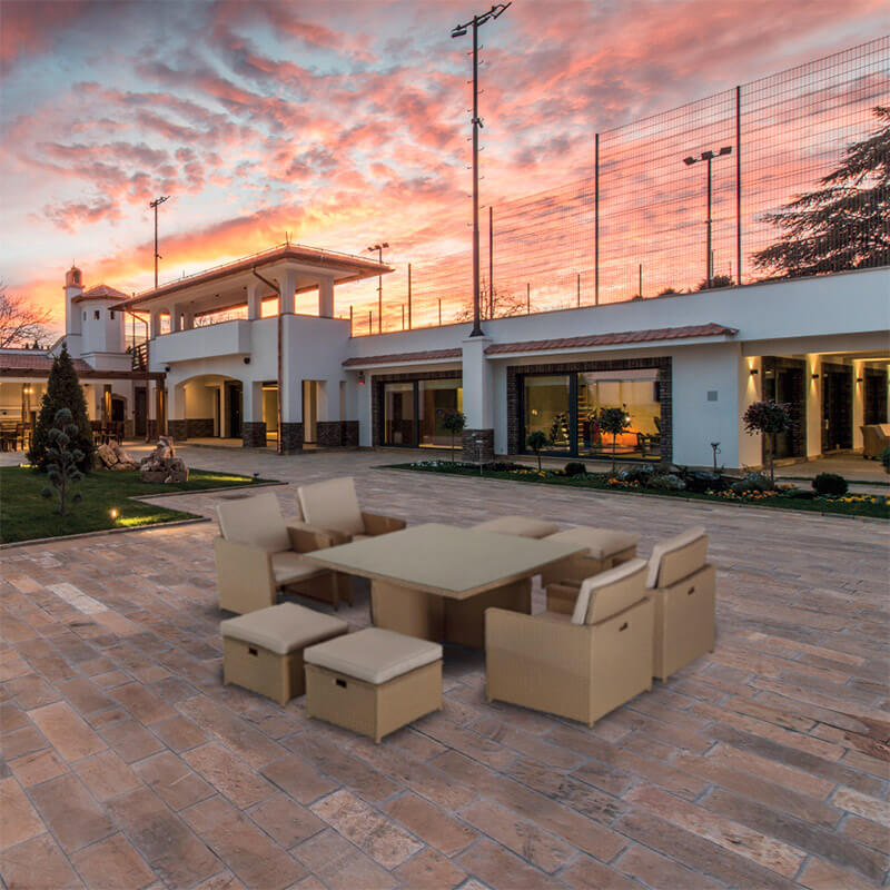 L'ensemble Caravaggio incarne de multiples qualités. Grâce aux fauteuils dotés de grands accoudoirs, de coussins confortables et de dossiers rabattables, l'assise est particulièrement confortable. Les repose-pieds utiles, grâce à leur taille généreuse et leur coussin, peuvent effectivement être utilisés comme un véritable siège, transformant notre ensemble de 4 à 8 places. La hauteur de la table et son étagère en verre trempé qui assure une fiabilité et une résistance maximales, rendent cet ensemble particulièrement adapté aux bars et aux buvettes où il sera possible de profiter d'excellents buffets et apéritifs en toute détente. Le dossier du fauteuil peut être fermé et les repose-pieds simplement placés en dessous et le tout rangé sous la table, garantissant ainsi une fonctionnalité maximale avec un encombrement minimum. Le design raffiné mais contemporain rend ce produit harmonieux dans les environnements de style moderne et classique. Le Rotin Synthétique bénéficie d'un traitement patiné particulier qui le rend très doux et confortable.