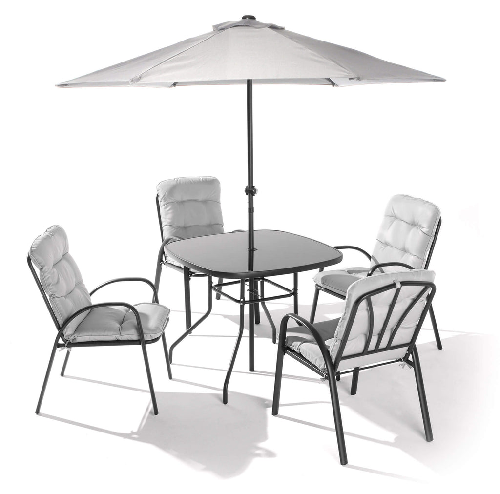 Table de jardin en acier 4 chaises et parasol avec coussins gris clair