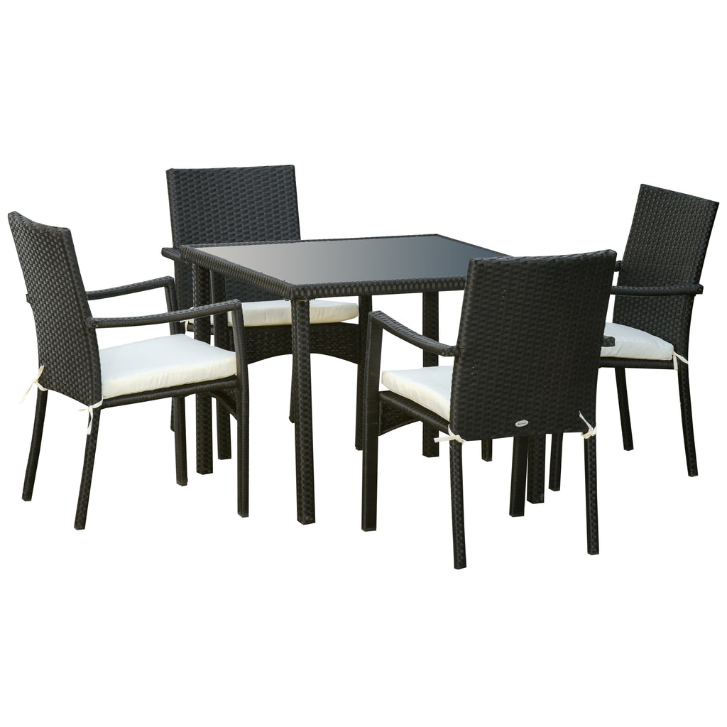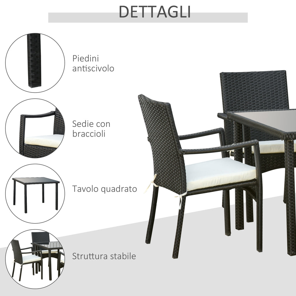 L'ensemble table et chaises de jardin en rotin 5 pièces est ce dont vous avez besoin pour tous vos espaces extérieurs. La table avec plateau en verre trempé a un look sophistiqué tandis que les 4 chaises vous permettent de profiter des espaces extérieurs en compagnie. Le rotin PE et le cadre en métal assurent solidité et longue durée de vie. Cet ensemble de salon de jardin est parfait sur la terrasse, le balcon, le bord de la piscine ou le patio.