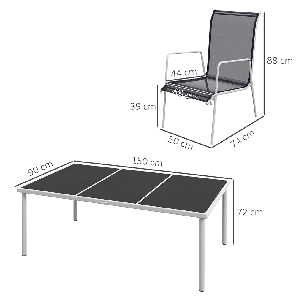 Set Tavolo con Top in Vetro 6 Sedie Impilabili da Giardino in Acciaio e Textilene Nero