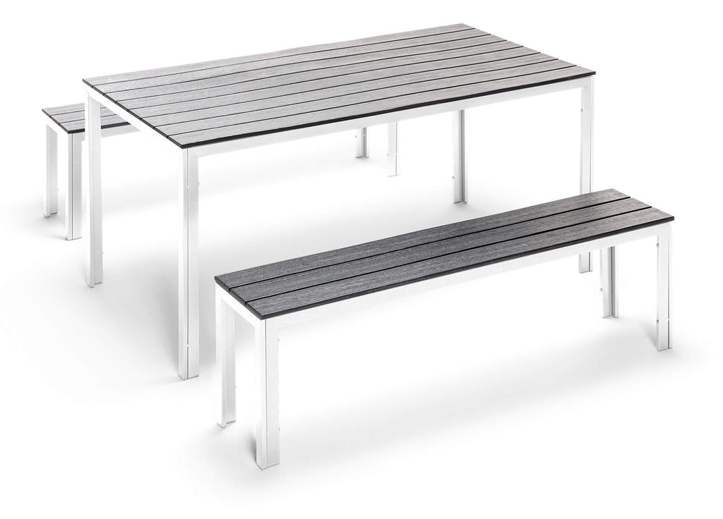 Ensemble table et 2 bancs de jardin en acier et polyéthylène gris