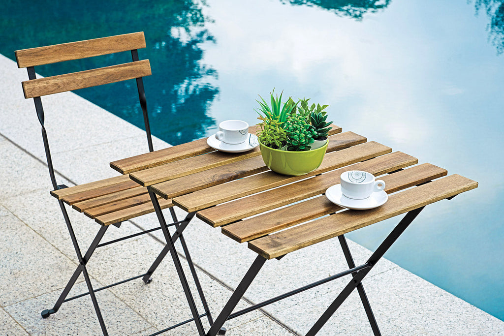 Set Tavolo e 4 Sedie da Giardino Pieghevoli Bistrò in Ferro e Legno di AcaciaSet Tavolo e 4 Sedie da Giardino Pieghevoli Bistrò in Ferro e Legno di Acacia