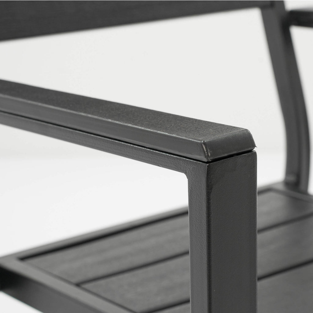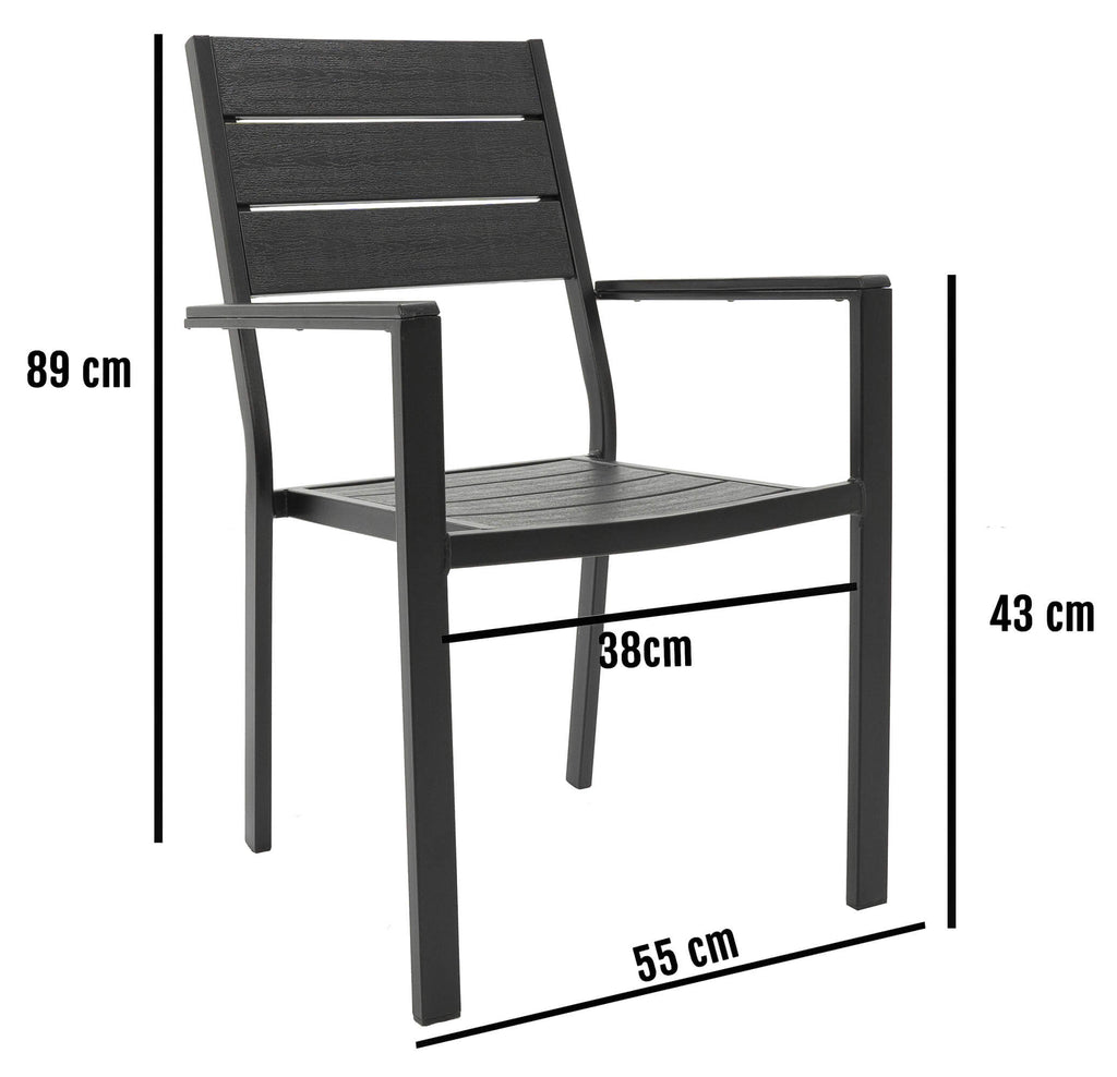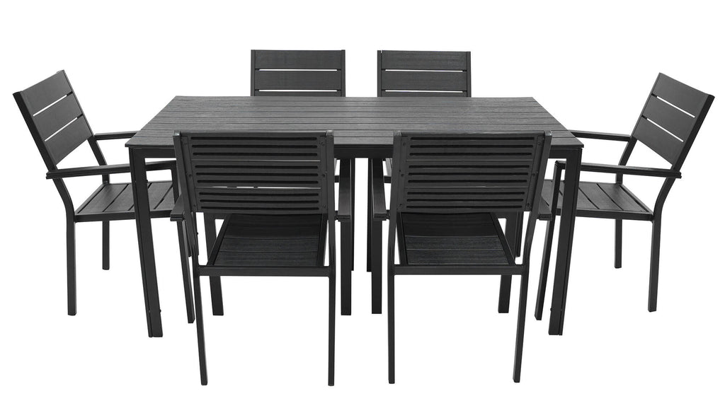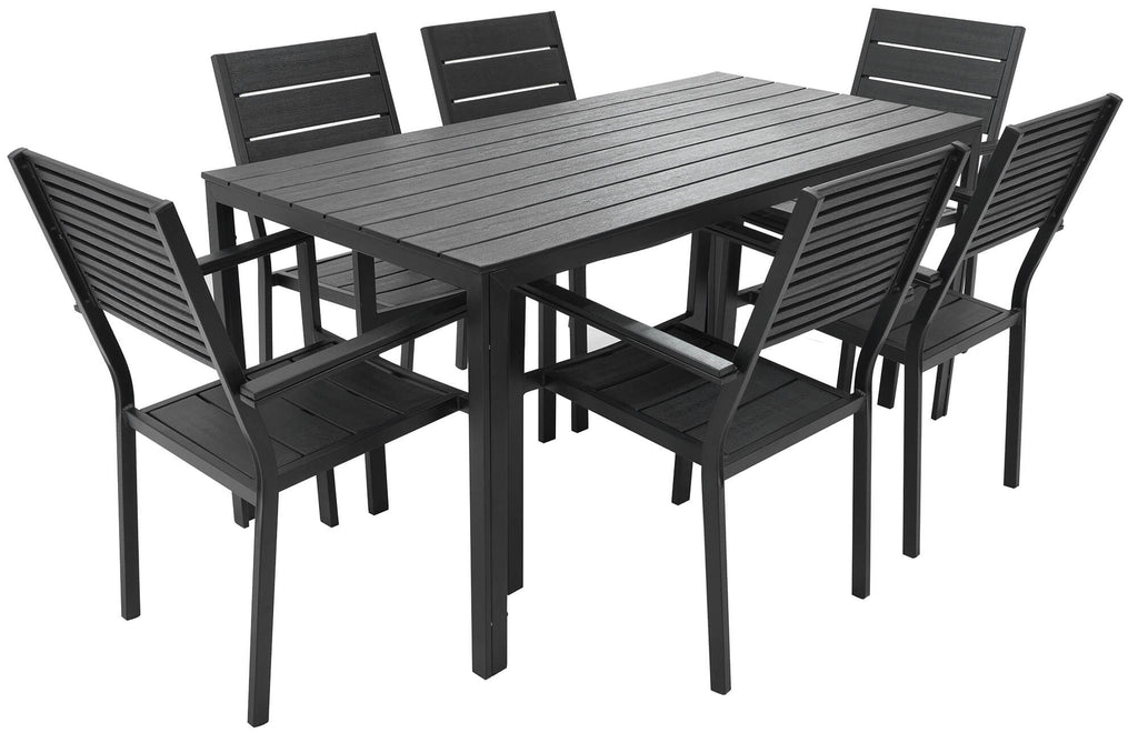 Cet ensemble complet en métal présente un design parfait qui ajoutera une touche de style à votre terrasse, jardin ou salle à manger. L'ensemble chaise et table est fabriqué en métal robuste peint par poudrage et avec des lattes en PEHD effet teck de 13 mm. Les chaises de salle à manger peuvent être empilées pour économiser de l'espace lorsqu'elles ne sont pas utilisées et sont faciles à nettoyer. L'ensemble complet Altair comprend une table et 6 chaises.