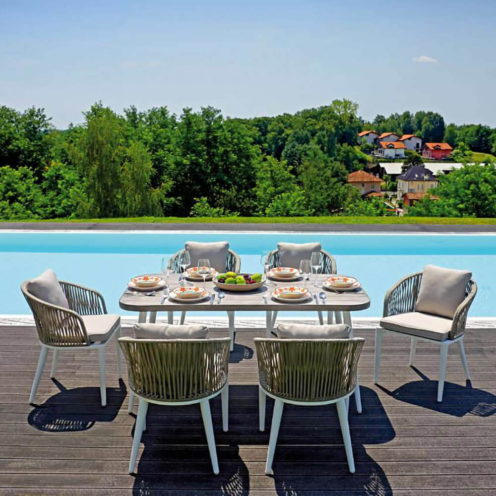 - Table en aluminium avec plateau effet bois gris clair