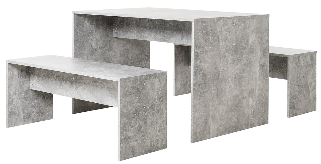 Ensemble table et 2 bancs en panneau de particules recouvert de mélamine couleur ciment. Les bancs peuvent être insérés sous la table lorsqu'ils ne sont pas utilisés. Très pratique et produit en Allemagne, l'ensemble Baviera se prête à être placé dans des contextes où le besoin d'espace rencontre le style contemporain mais avec un design simple et fonctionnel.