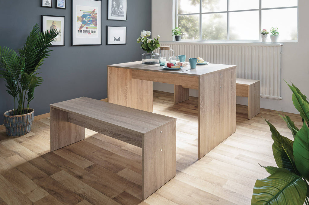 Ensemble table et 2 bancs en panneau de particules recouvert de mélaminé couleur chêne. Les bancs peuvent être insérés sous la table lorsqu'ils ne sont pas utilisés. Très pratique et produit en Allemagne, l'ensemble Baviera se prête à être placé dans des contextes où le besoin d'espace rencontre le style contemporain mais avec un design simple et fonctionnel.