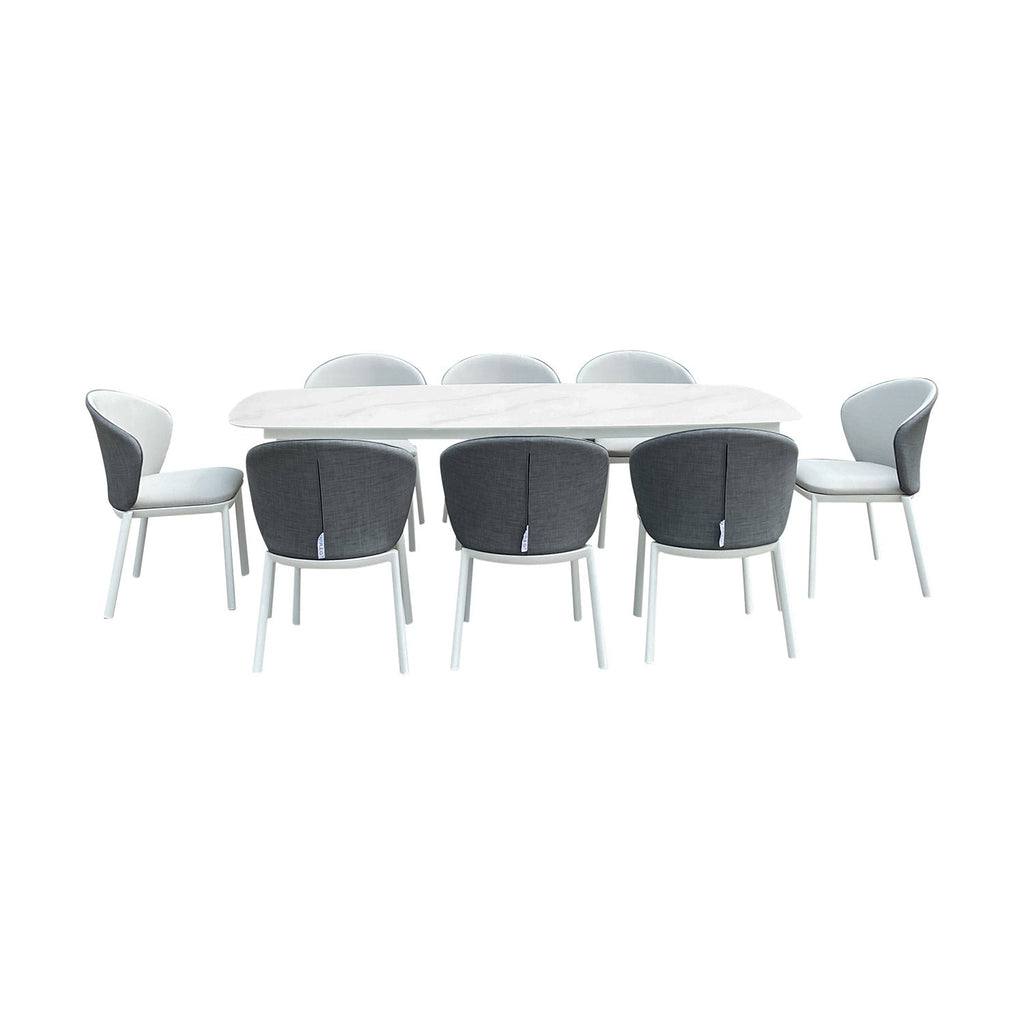 Imaginez un salon de jardin avec une table rectangulaire et six chaises. La table a une structure en aluminium blanc mat avec un plateau en pierre synthétique blanche, tandis que les chaises sont en aluminium blanc avec un tissu textilène rembourré gris clair. Un ensemble élégant et fonctionnel pour les espaces extérieurs.