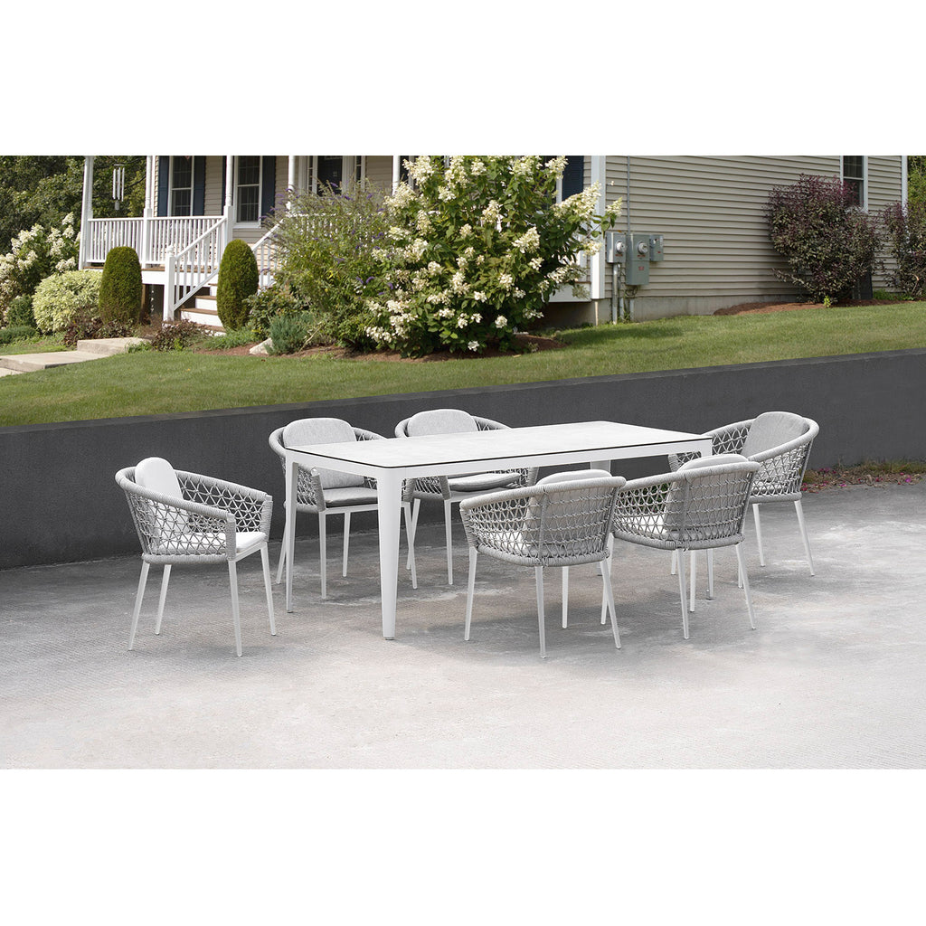 Imaginez l'ensemble Venus Dining 180 : une table rectangulaire en aluminium thermolaqué blanc avec un plateau en verre trempé effet céramique blanc, flanquée de six chaises avec accoudoirs. Les chaises ont une structure en aluminium et un revêtement en corde de polyester blanc, avec des coussins en Olefin avec un tissu doux et résistant. Un ensemble élégant et confortable pour les espaces extérieurs.