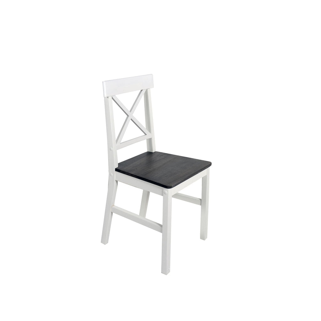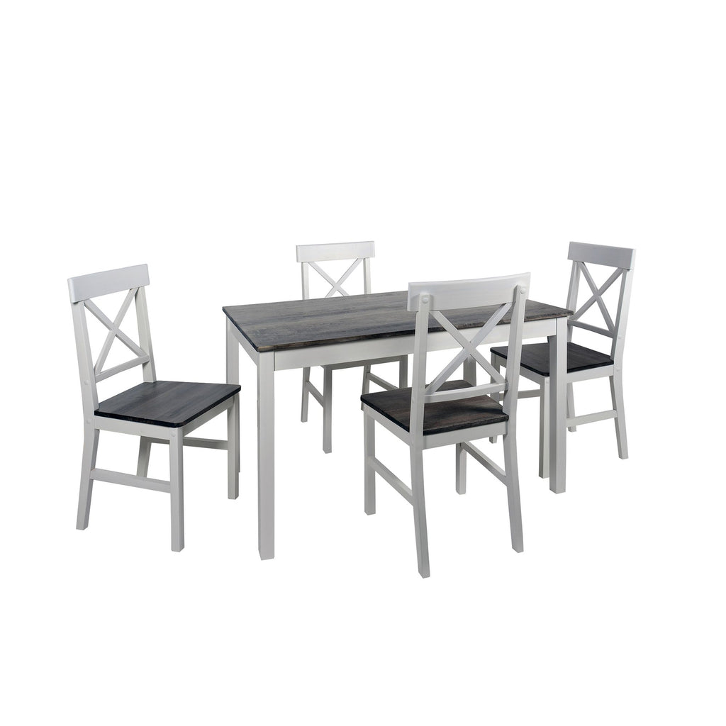 Ensemble composé de : table avec structure en bois, pieds blancs et plateau gris. 4 chaises blanches avec assises gris fumé.