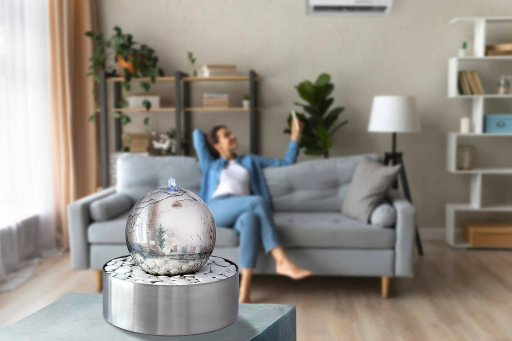 Illuminazione: Dotata di faretto LED integrato, che aggiunge un tocco di luminosità e rende la sfera un punto focale in ogni spazio. La fontana a sfera è dotata di una piccola pompa di ricircolo a basso consumo, inserita all'interno della base, il che la rende completamente autonoma e non richiede collegamenti all'impianto idrico.