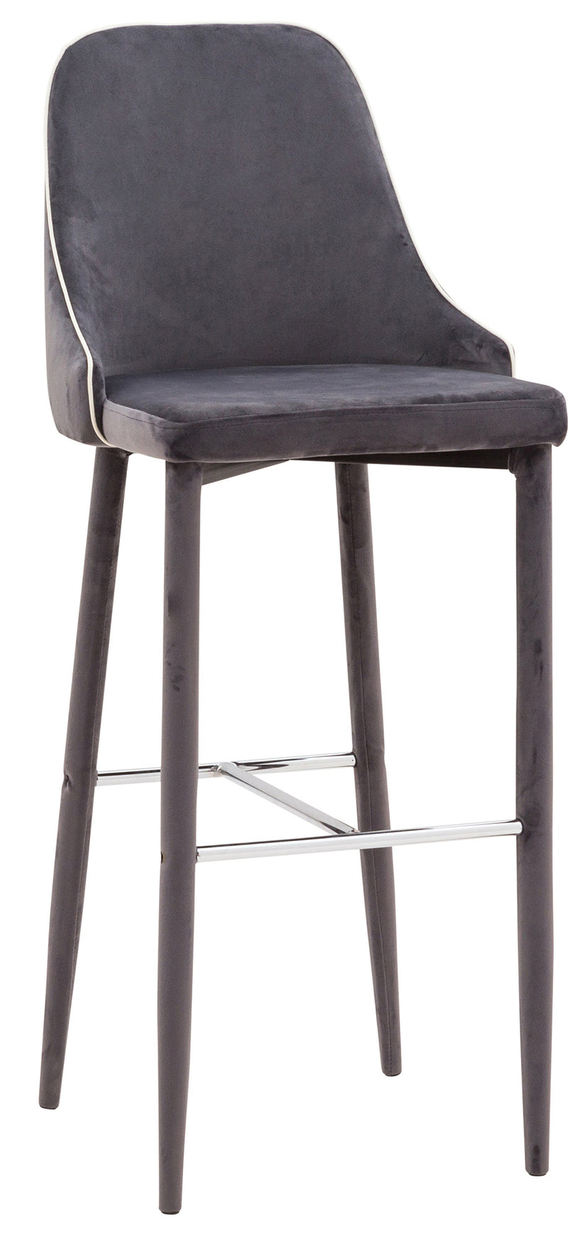 Tabouret avec structure tubulaire en métal, assise et dossier avec rembourrage en polyuréthane et revêtement en tissu velouté avec cordon profilé en simili cuir blanc. Repose-pieds en métal chromé.