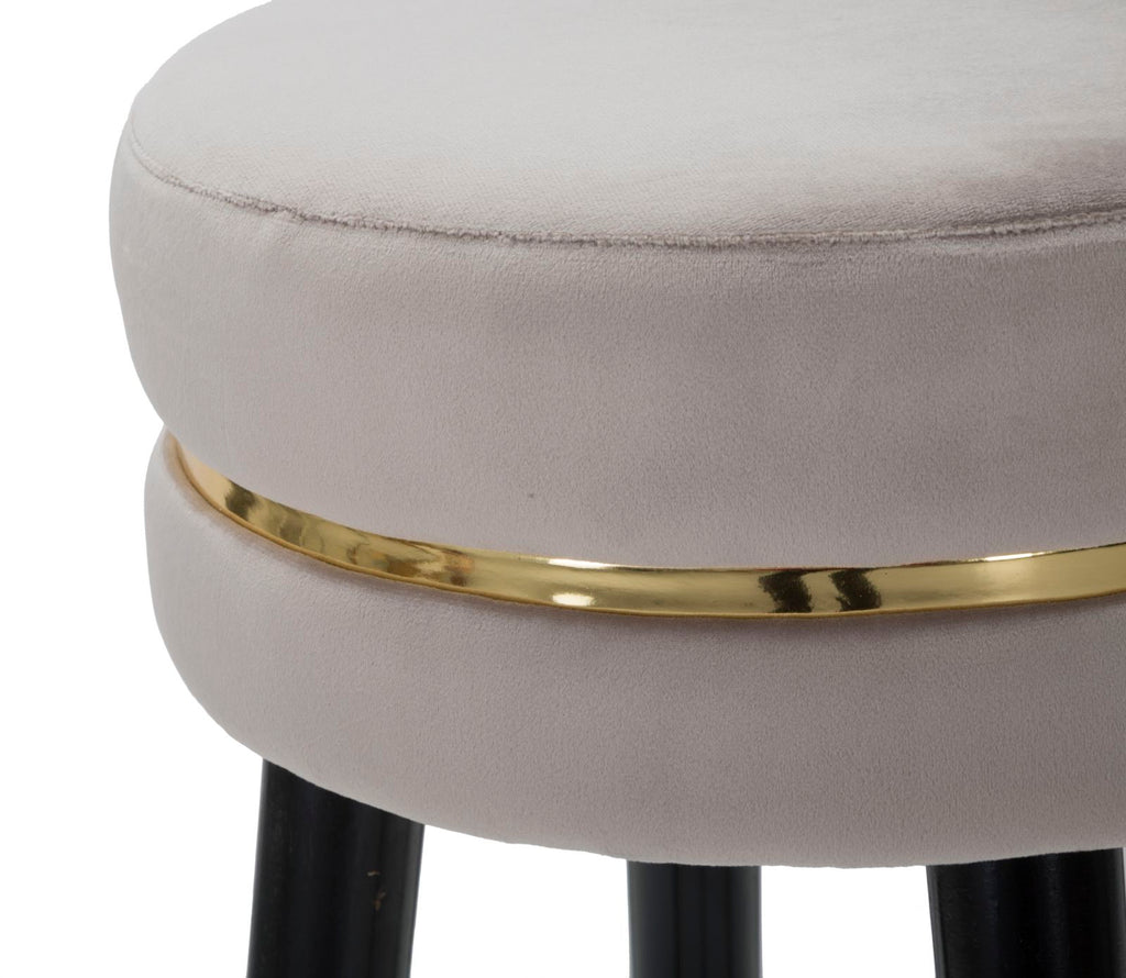 Tabouret de bar en bois et velours gris. Sièges avec une finition dorée inspirés des cabines d'essayage des grandes stars d'Hollywood. Idéal à placer dans la chambre ou dans le salon pour se sentir comme une star.