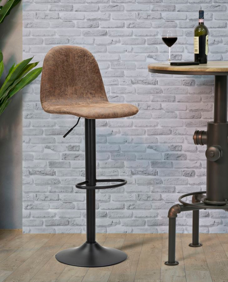 Tabouret en éco-cuir et métal noir réglable en hauteur de style industriel au design simple mais décisif adapté à tout type de mobilier.