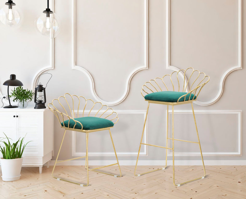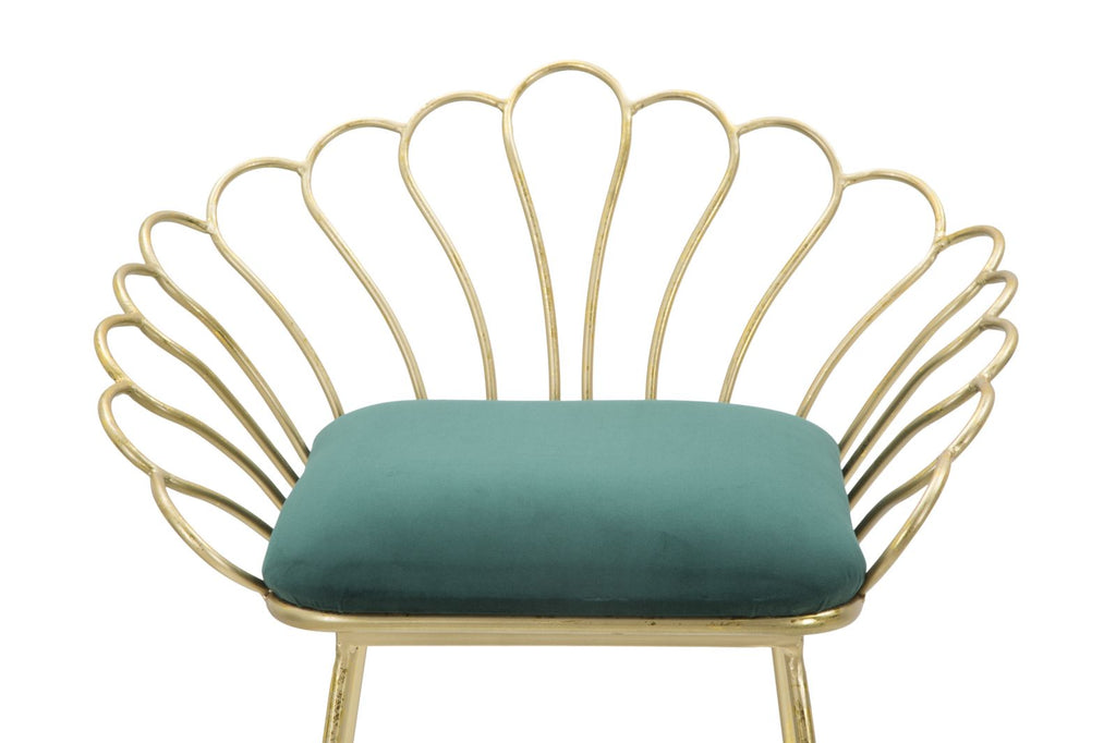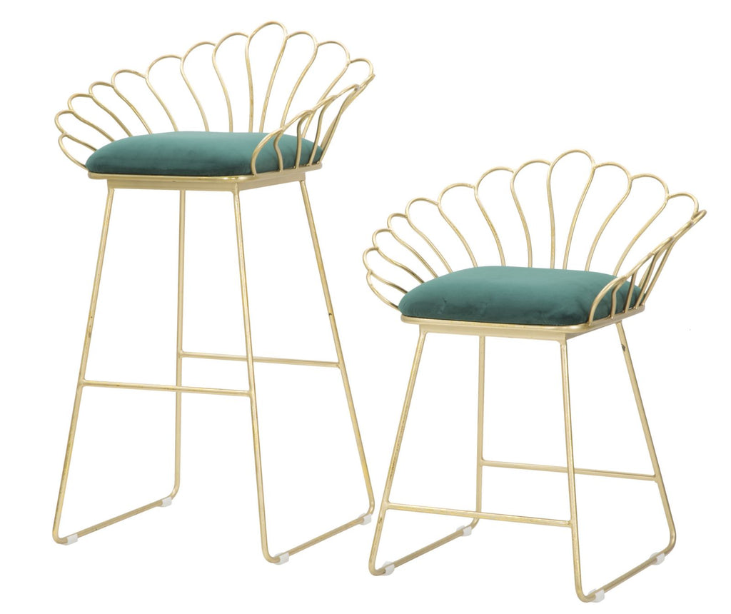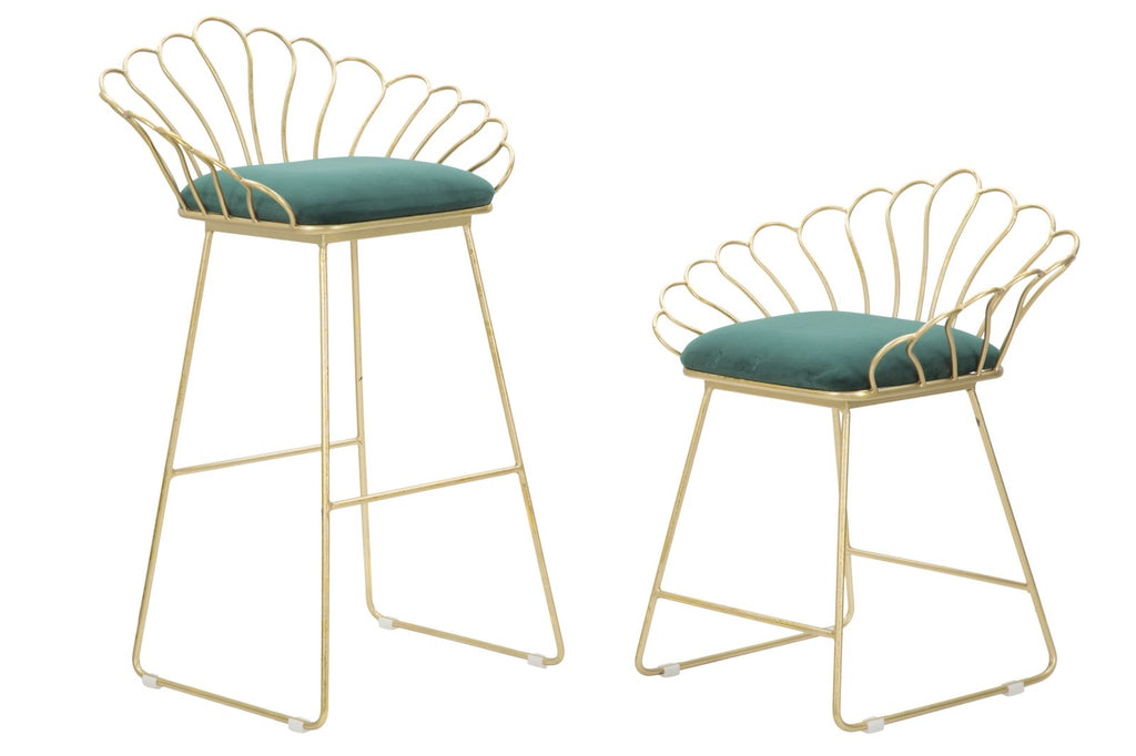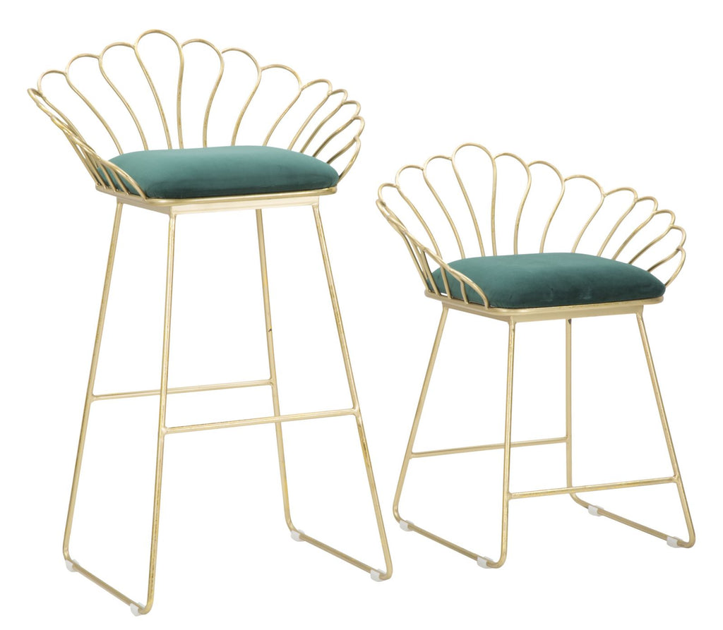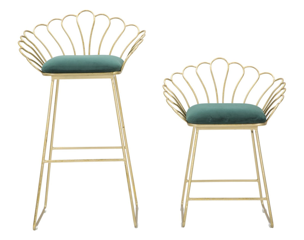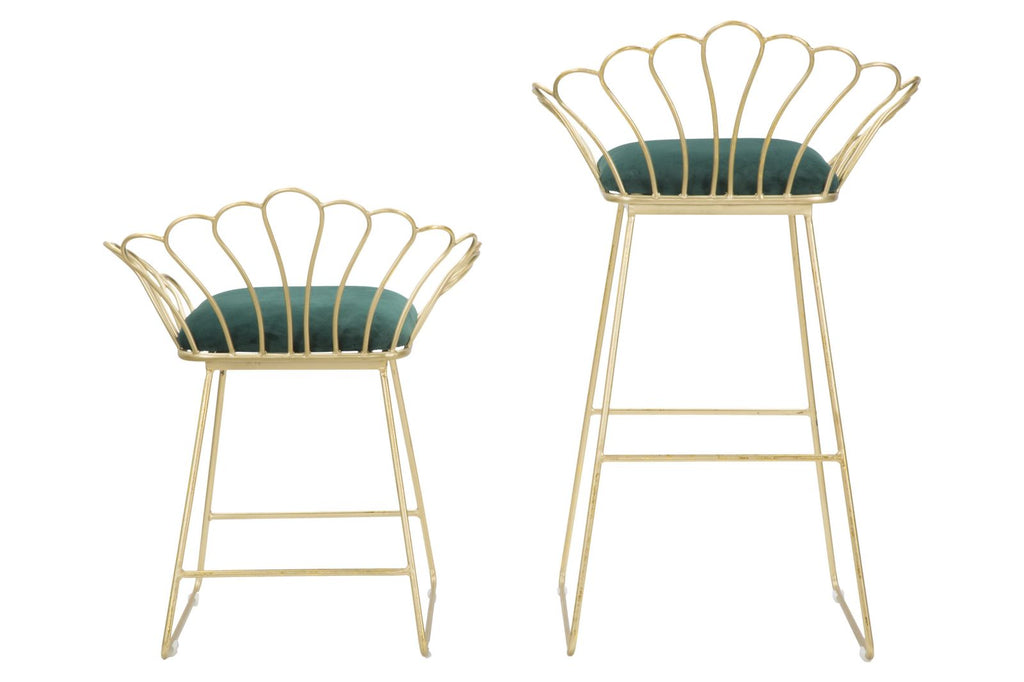 Paire de tabourets en acier et velours. L'élégance de l'acier doré et du velours vert s'associent pour créer un style unique. Un ensemble de tabourets au design sobre mais attrayant. Des éléments d'ameublement qui rappellent les environnements luxueux de l'Hôtel Plaza à New York. Recréez l'atmosphère magique de Great Gatsby dans votre intérieur