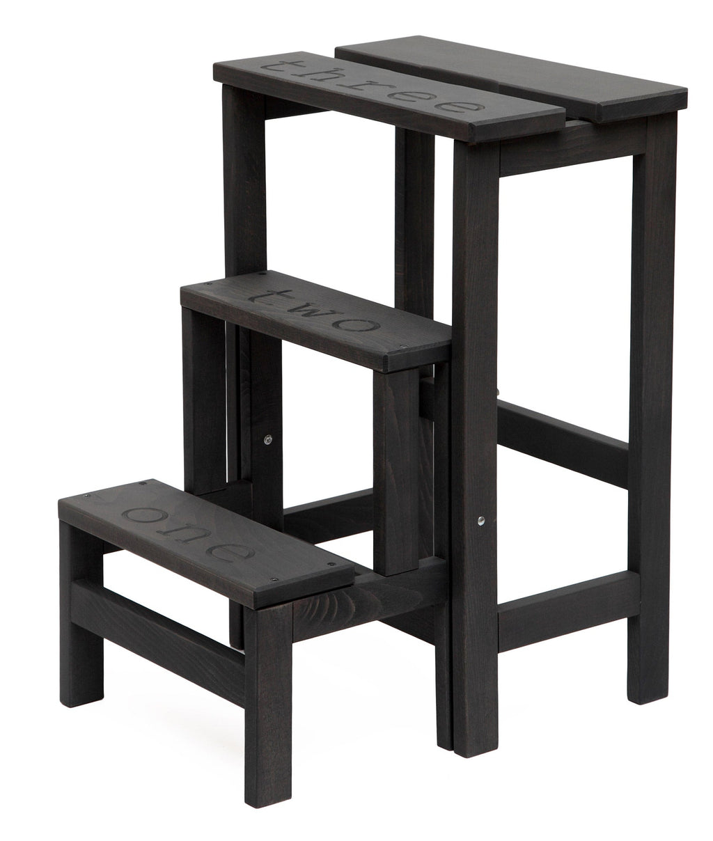 Fiable, sûr, indispensable avec une pincée d'élégance et de gaieté. Tabouret pratique en hêtre massif : grâce aux deux marches pivotantes, il peut être utilisé comme une échelle solide si nécessaire. Particulièrement utile pour accéder aux étagères supérieures des armoires et des bibliothèques ou pour s'asseoir sur la péninsule dans la cuisine comme sur un tabouret d'ameublement normal. Les chiffres Un Deux Trois sont gravés en bas-relief sur les étagères. La coloration de la surface est réalisée avec des couleurs naturelles à l'eau enduites de deux couches de vernis acrylique opaque : le vernis acrylique garantit une excellente résistance aux rayures et préserve les couleurs des variations chromatiques dues au temps et à la lumière. Cette échelle en bois est testée selon la norme européenne UNI EN131.