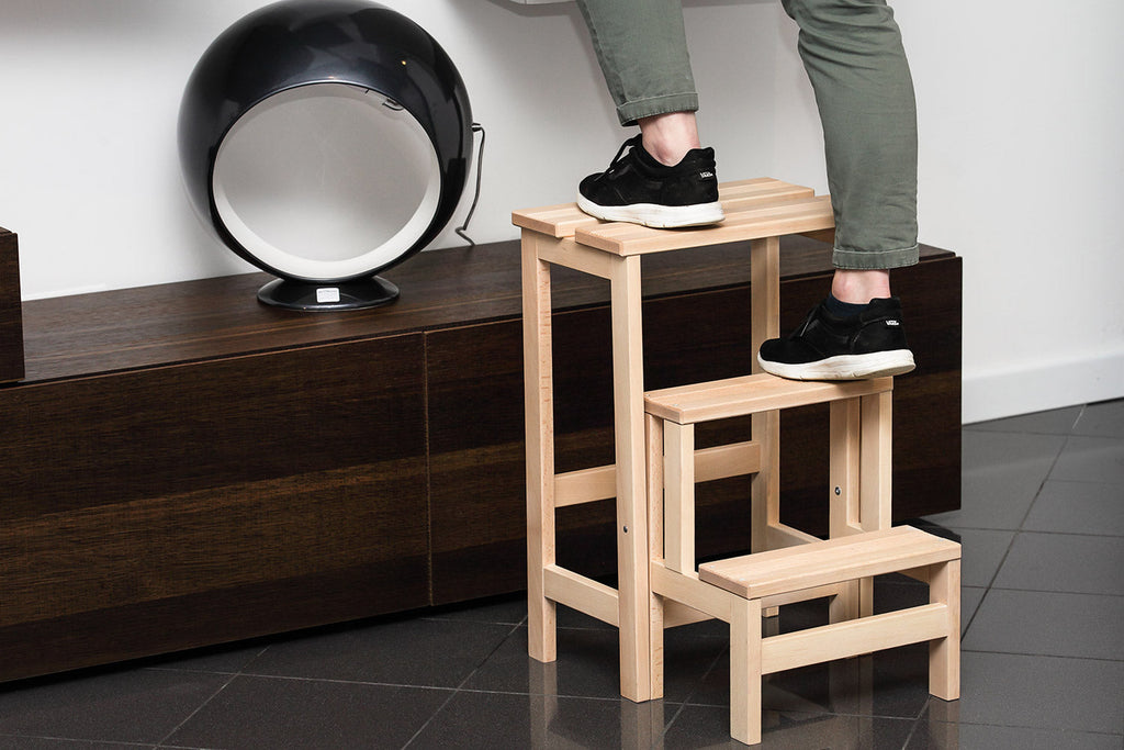 Fiable, sûr, indispensable avec une pincée d'élégance et de joie. Tabouret pratique en hêtre massif : grâce aux deux marches pivotantes, il peut être utilisé comme échelle solide si nécessaire. Particulièrement utile pour accéder aux étagères les plus hautes des armoires et des bibliothèques ou pour s'asseoir sur la péninsule de la cuisine comme sur un tabouret d'ameublement normal. La surface supérieure présente des rainures horizontales antidérapantes. La coloration de la surface est réalisée avec des couleurs naturelles à l'eau recouvertes de deux couches de peinture acrylique mate : la peinture acrylique garantit une excellente résistance aux rayures et préserve les couleurs des variations chromatiques dues au temps et à la lumière. Cette échelle en bois est testée selon la norme européenne UNI EN131