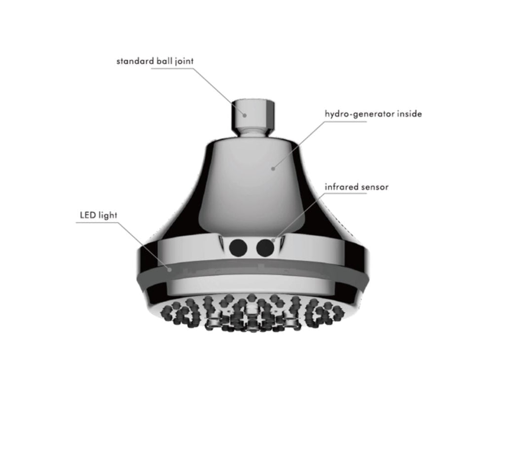 Pommeau de douche infrarouge 4 fonctions avec capteur pour changer le jet d'eau en, pluie, massage + jet, jet, nébulisation. Il n'a pas besoin de batterie ni d'électricité, un hydrogénérateur est installé à l'intérieur du corps de la pomme de douche qui fournit l'énergie nécessaire à ses fonctions. Il exploite pratiquement l'énergie de l'eau.