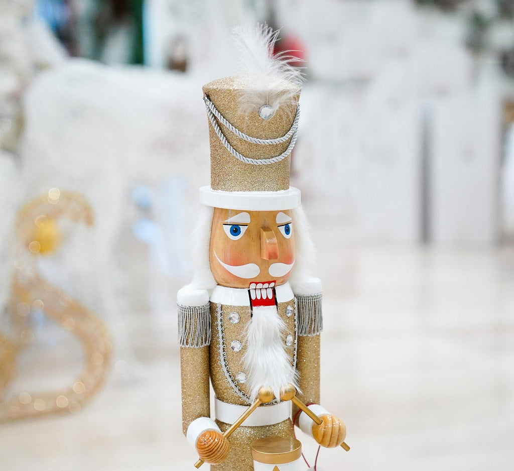 Casse-noix de Noël en bois, peint à la main avec des paillettes dorées et un tambour.