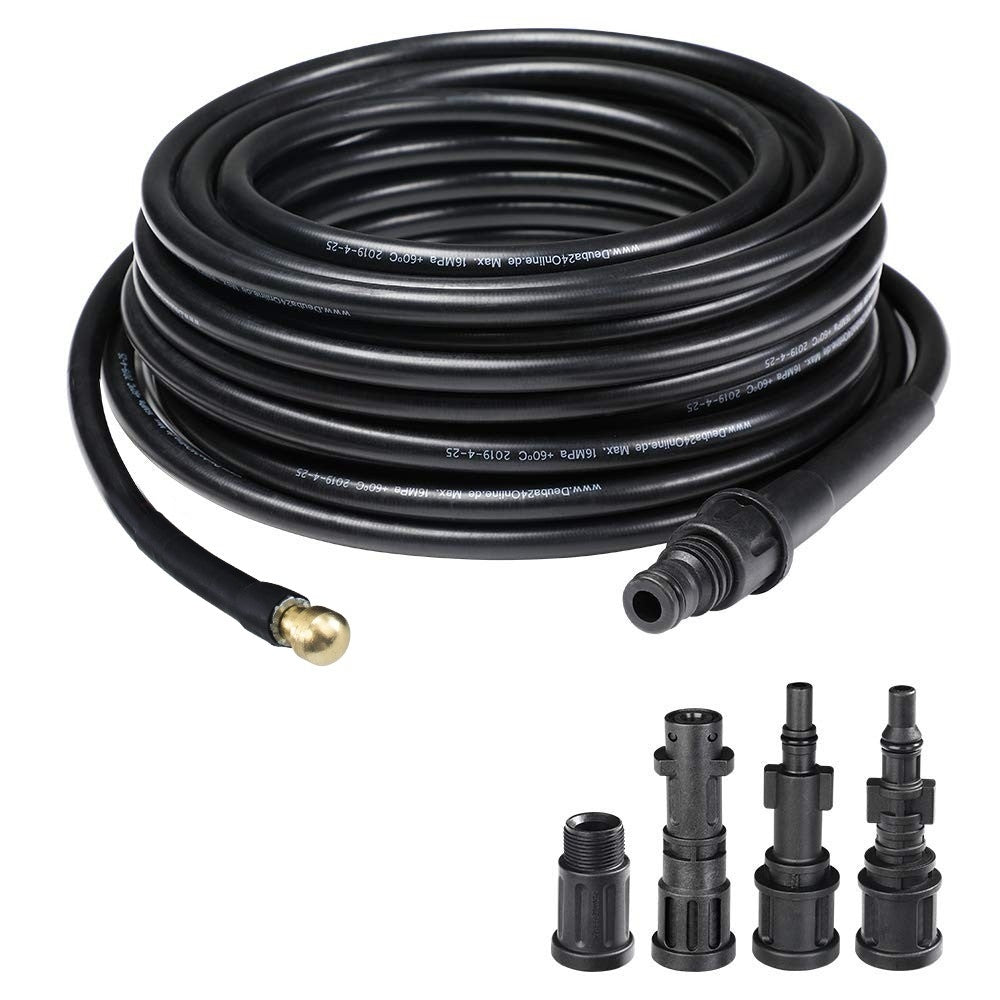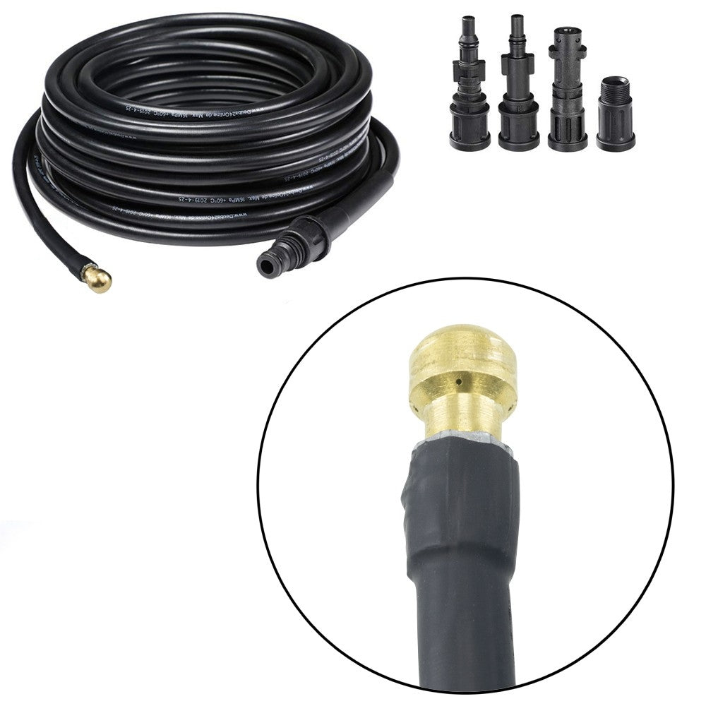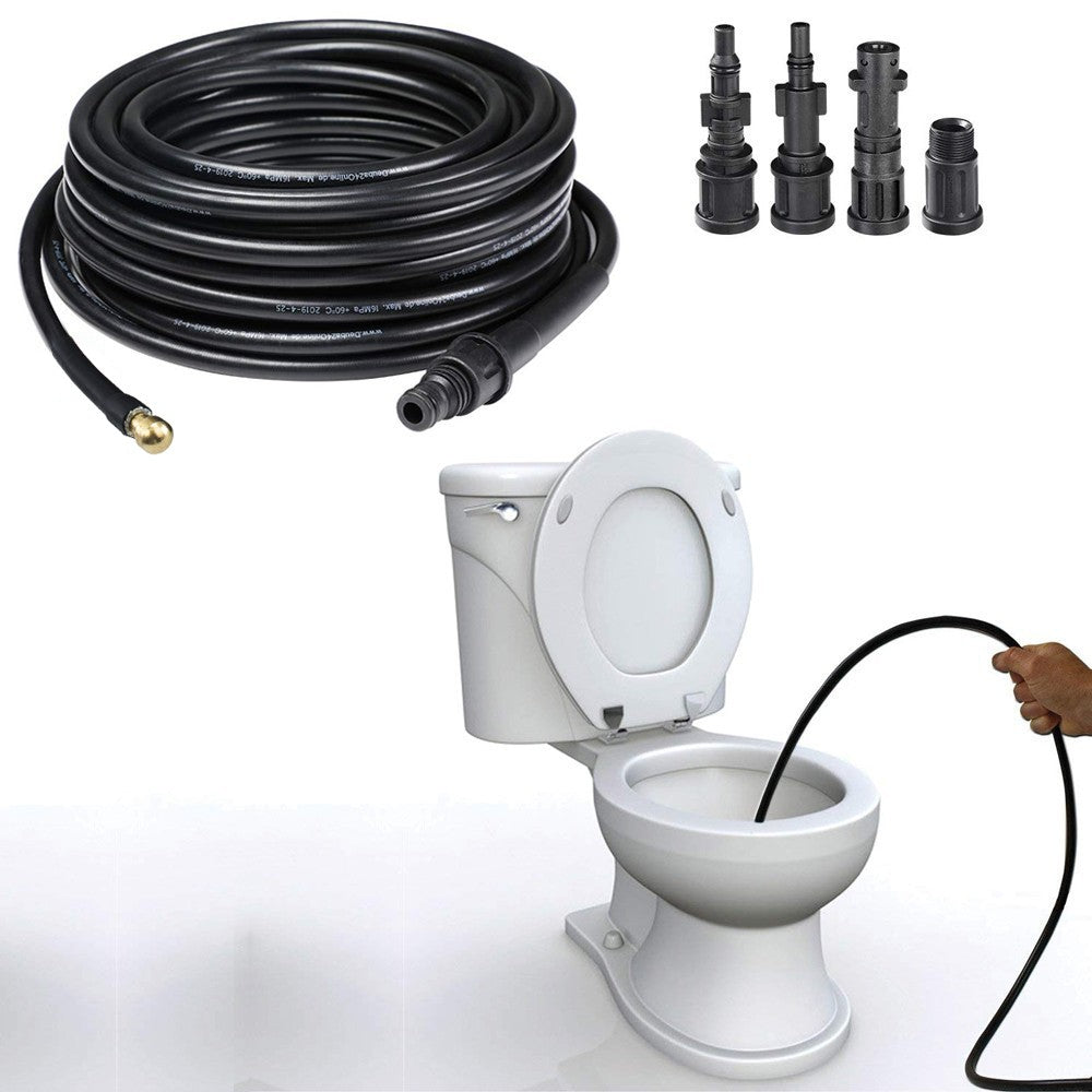 Cette sonde est conçue pour déboucher facilement les canalisations, gouttières et toilettes bouchées sans utiliser de produits chimiques ni de détergents. Grâce aux 4 buses fournies, il s'adapte parfaitement à la plupart des nettoyeurs haute pression disponibles sur le marché et est idéal pour nettoyer les sols extérieurs et intérieurs ou le mobilier de jardin. Le tuyau peut être utilisé avec une température d'eau maximale de 60° et peut résister à une pression maximale de 160BAR