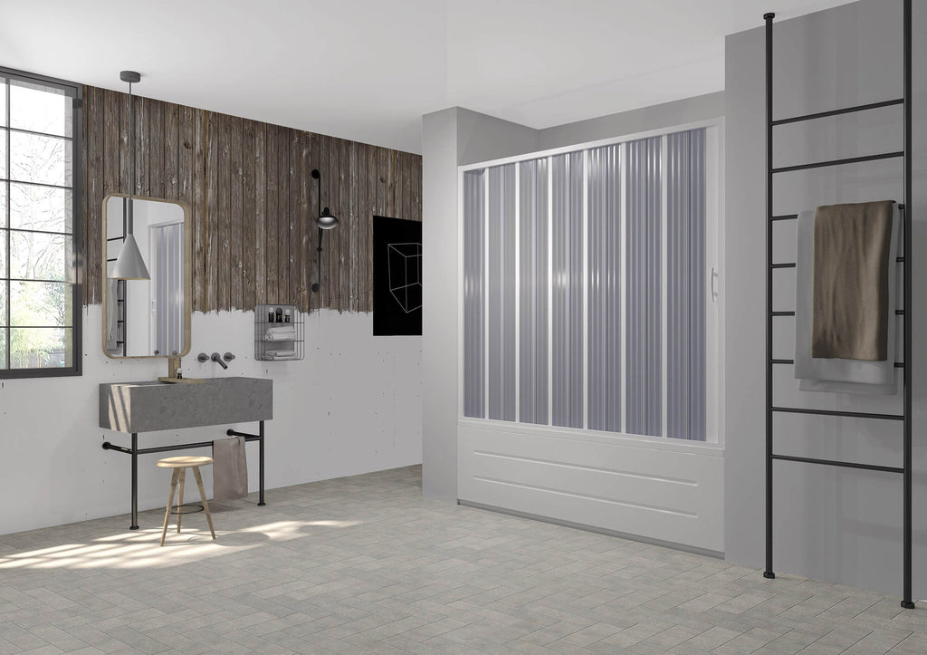 Pare-baignoire linéaire à ouverture latérale en PVC pliable peu encombrant. Flexible, anti-accident, encombrement minimum, réductible à coupe guidée, réversible, anti-calcaire, anti-corrosion, visserie inox, 100% tolérant à l'eau.