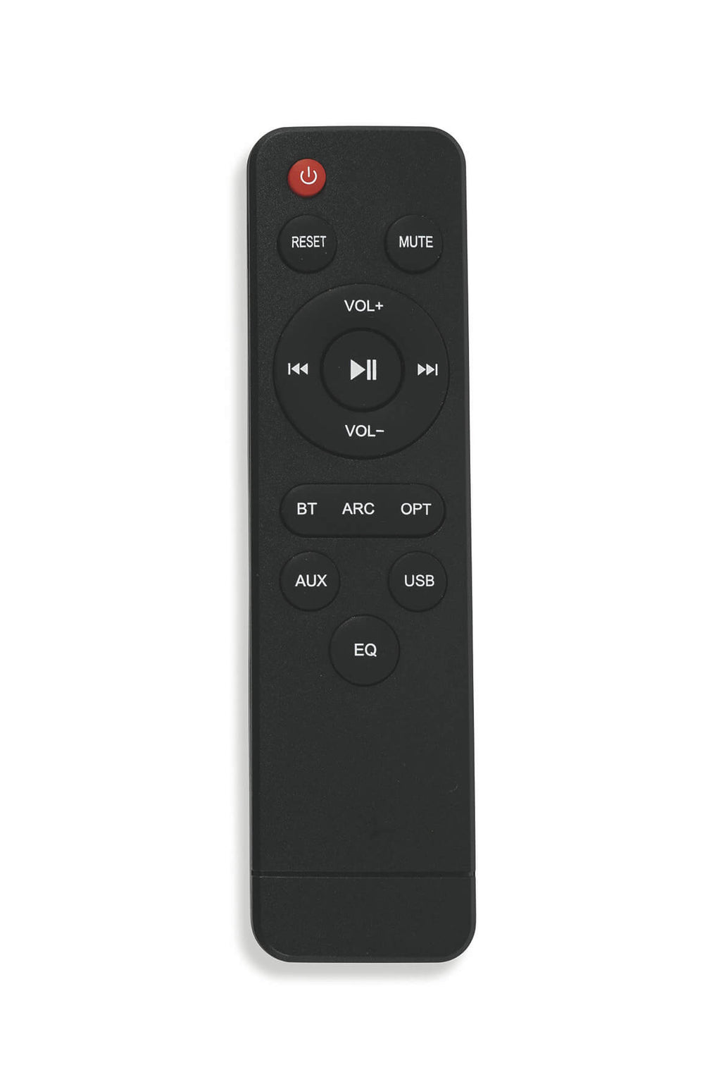 - Le paquet contient : télécommande, barre de son, caisson de basses, câble d'entrée audio et câble d'alimentation