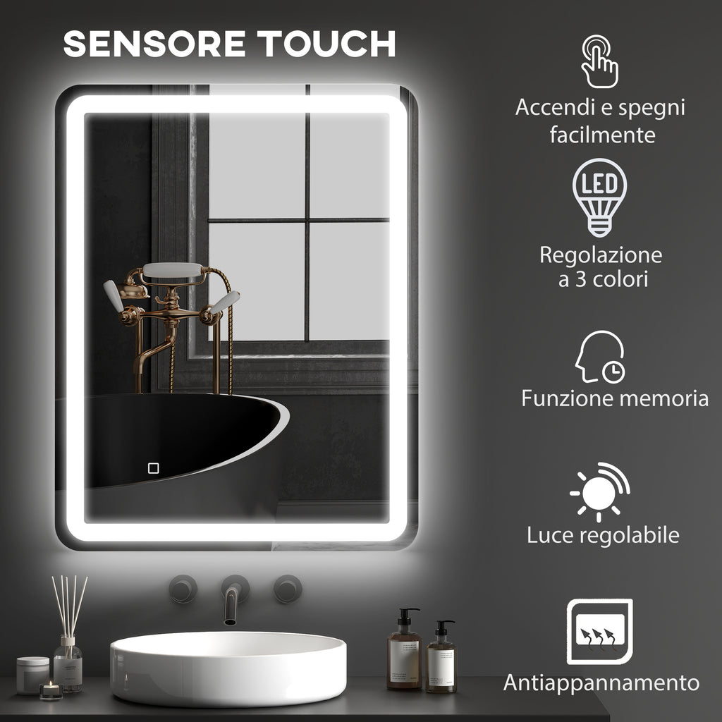 Specchio Bagno 70x90 cm LED Touch con Luce Dimmerabile a 3 Temperature e Antiappannamento