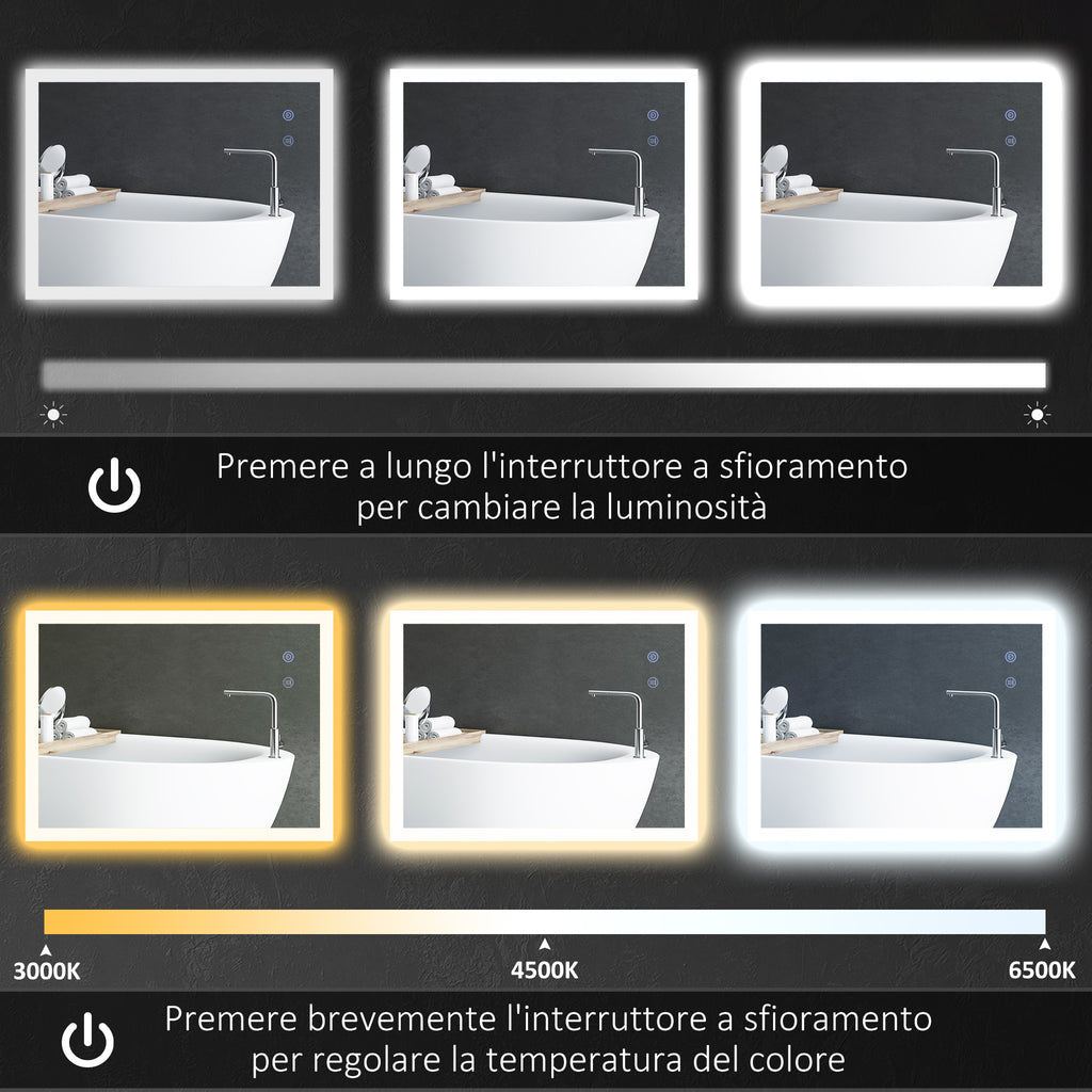 - LUCI LED REGOLABILI: Questo specchio LED per bagno è dotato di luminosità regolabile e di 3 colori (caldo a 3000K, naturale a 4500K e bianco a 6500K). È sufficiente toccare l'interruttore con una pressione prolungata per cambiare la luminosità e una pressione breve per regolare il colore della luce