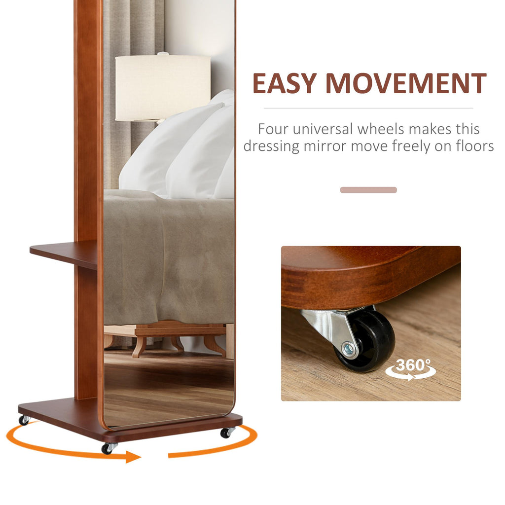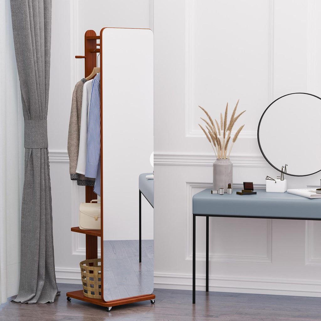 Miroir sur pied 40x44,5x170 cm avec étagères porte-manteaux et roues en noyer
