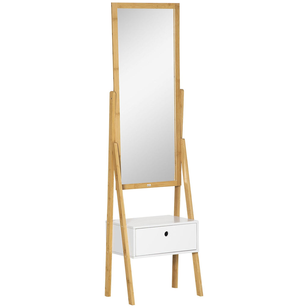 Miroir sur pied 45x30x160 cm avec tiroir en MDF et bambou en couleur blanc et bois