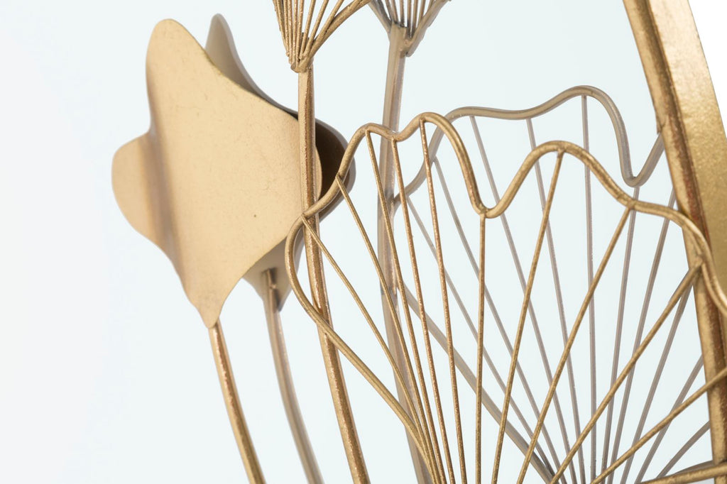 Miroir mural rond en métal doré. Le cadre simple et la délicate décoration florale rappellent la simplicité et la beauté de la nature.