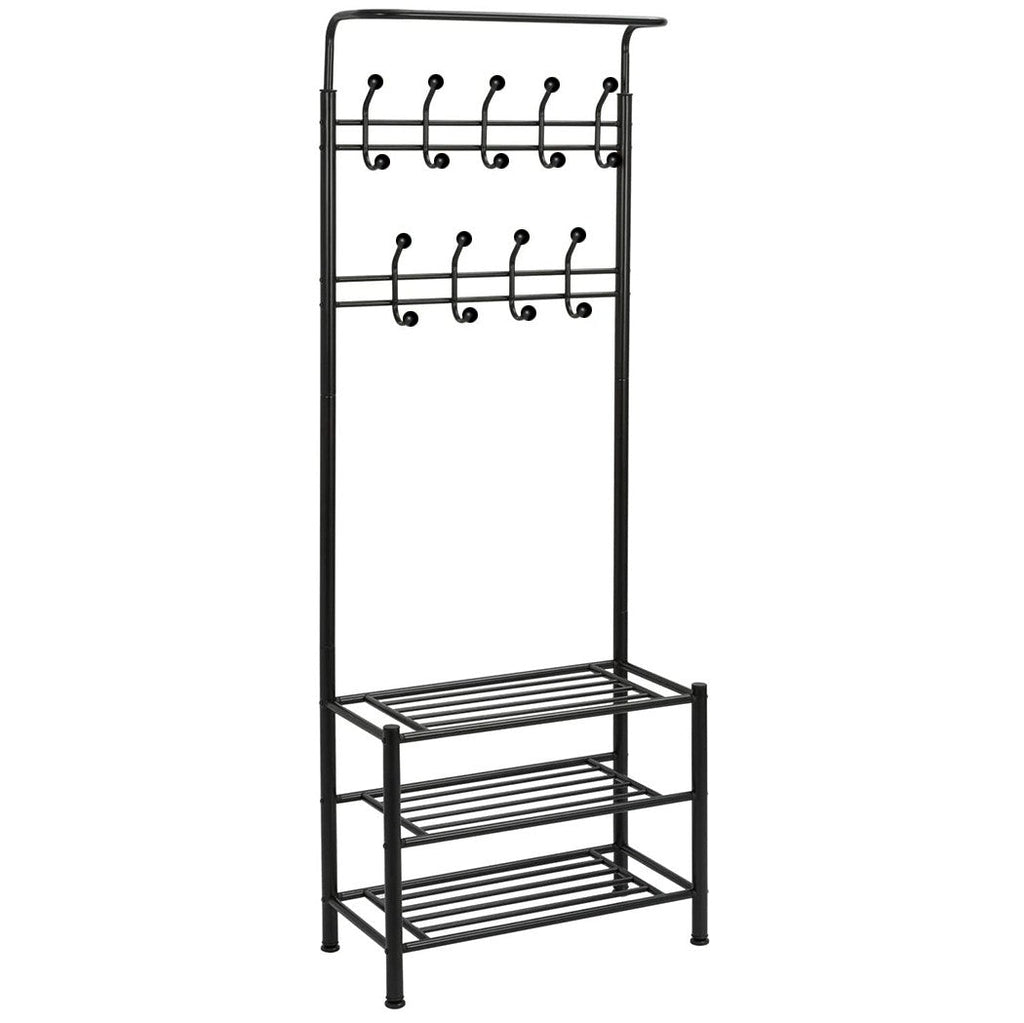 Structure de la combinaison porte-manteau et porte-chaussures, 18 crochets avec les tiges supérieures offrant plus d'espace de suspension, une étagère en métal à trois niveaux vous permet de mettre plus de chaussures et de sacs.