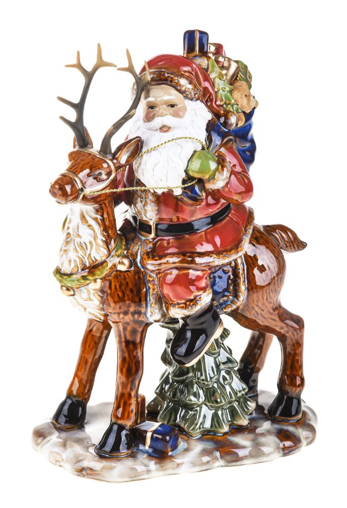 - Figurine en céramique représentant le Père Noël sur un renne.
