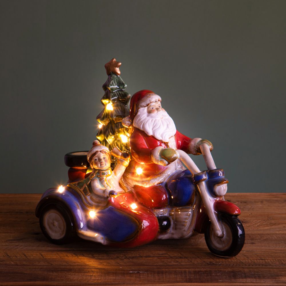 Figurine Père Noël avec Side Car avec LED 31 cm en Porcelaine