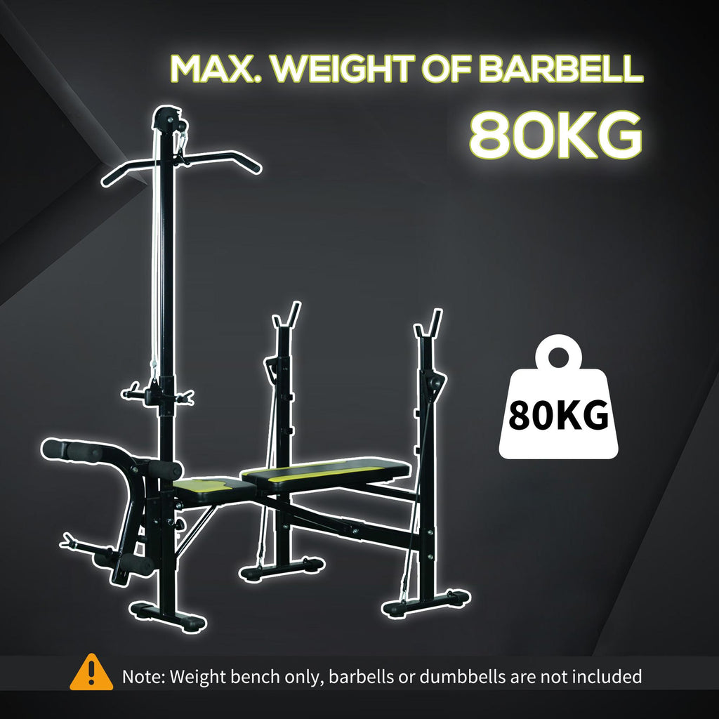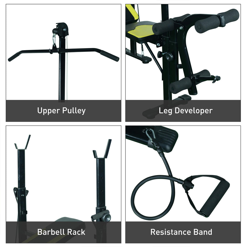 - Barre de traction : ce banc de gym dispose d'une barre de traction pour renforcer vos bras. La poulie à roulement à billes permet une levée optimale des poids pour effectuer des exercices de tirage vers le bas.