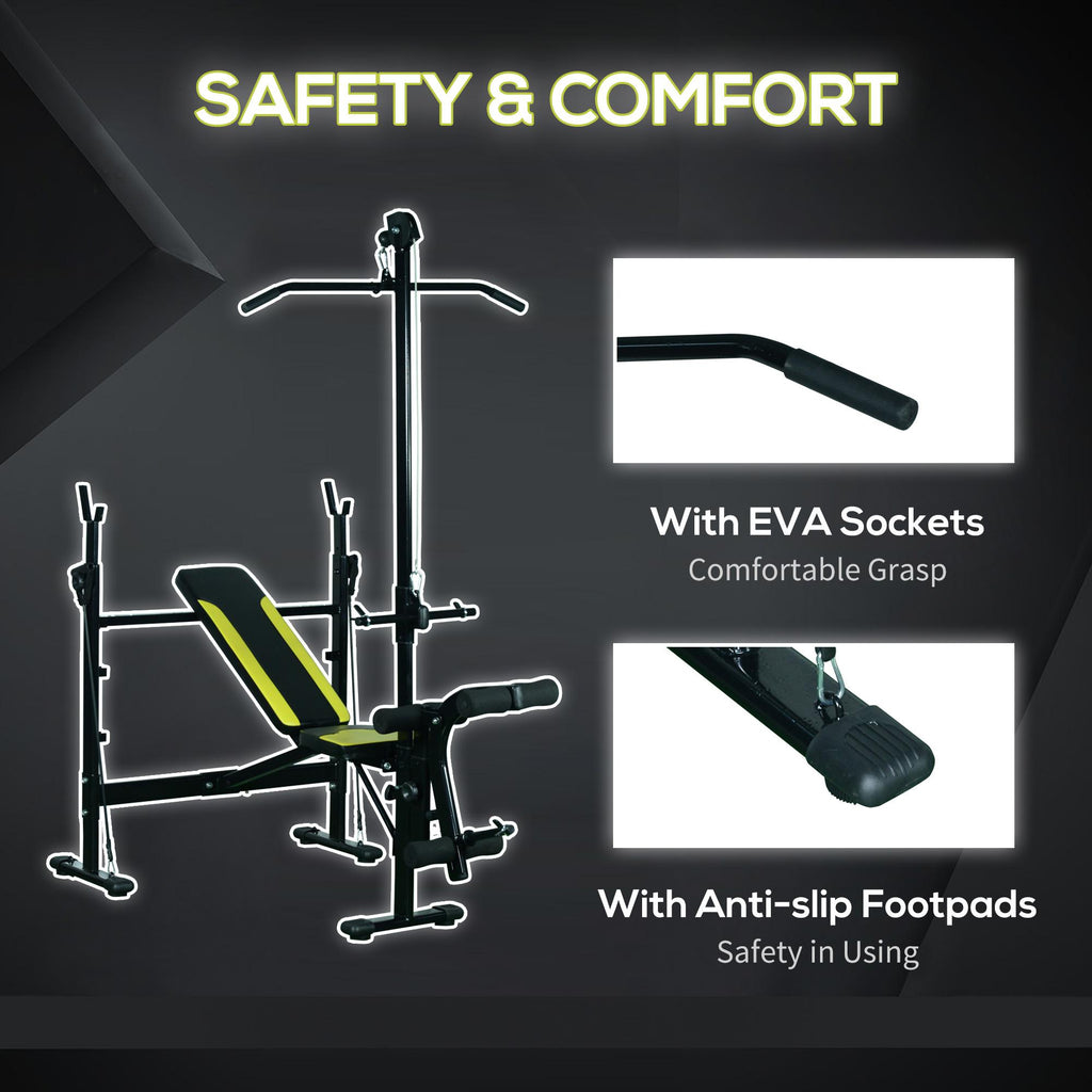 - SÉCURITÉ ACCRUE : les crochets de sécurité intégrés et la conception anti-écrasement empêchent tout risque de blessure. Les pieds du banc de fitness sont en caoutchouc, pour vous offrir une stabilité optimale pendant l'entraînement. Remarque : les poids ne sont PAS inclus.