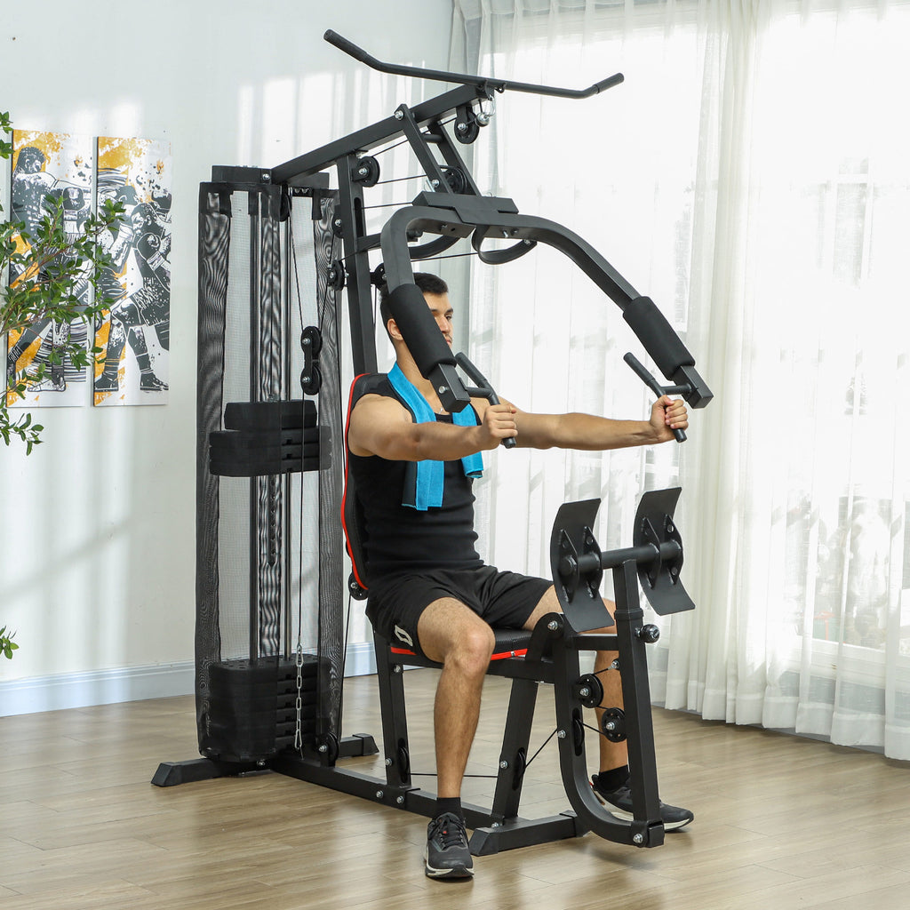 Trasforma il tuo spazio home gym con la palestra multifunzione! Dotata di una carrucola alta, stazione per muscoli pettorali a doppia azione e una solida pressa per gambe, è costruita con acciaio rinforzato e pesi da 45 kg. Ideale per tutti i livelli, questa stazione fitness garantisce allenamenti sicuri e stabili a casa, grazie alle impugnature e ai piedini antiscivolo.