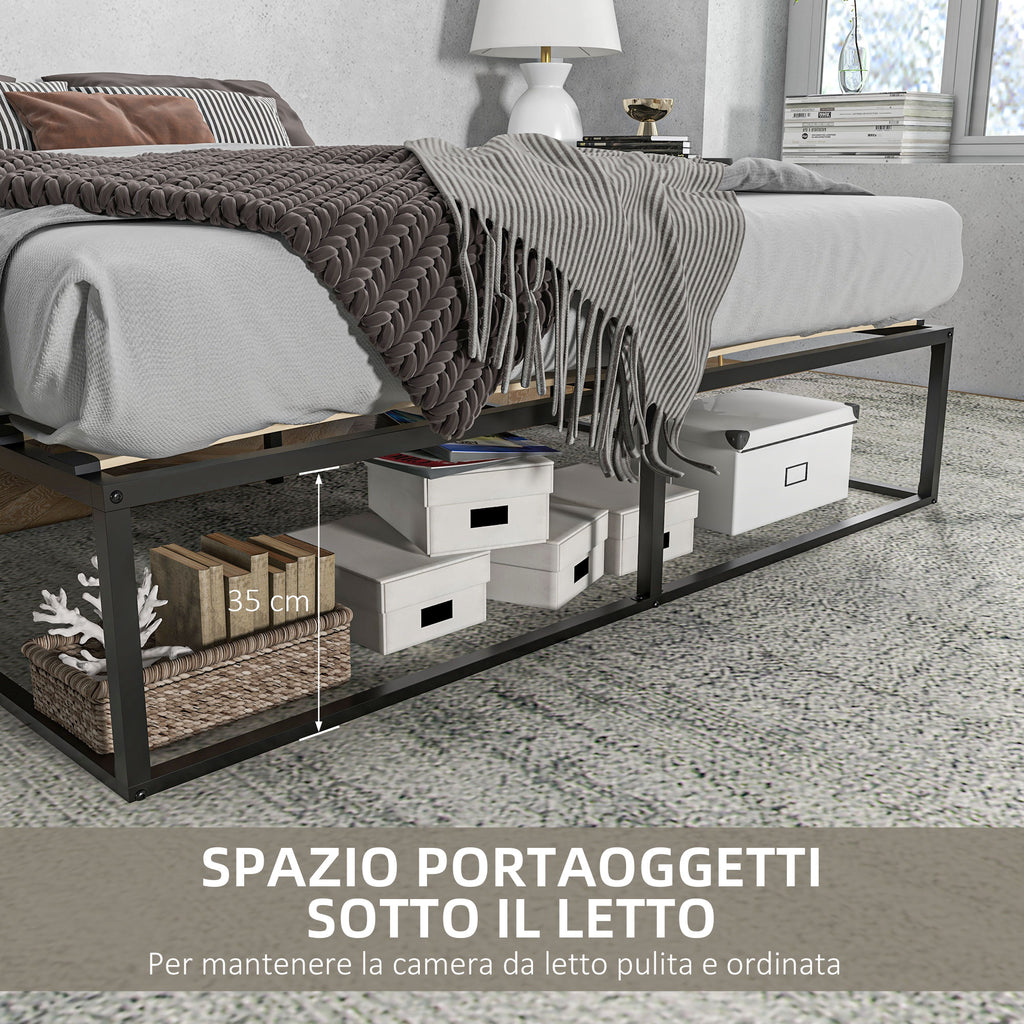 Grazie a questa struttura letto dallo stile minimal e moderno, potrai arredare facilmente qualsiasi camera da letto. La struttura è realizzata in acciaio verniciato a polvere con delle gambe centrali che ti sostengono a dovere e ti fanno dormire bene. Le doghe in compensato incorporate sostengono il materasso in ogni momento. È inoltre presente un ampio spazio sotto il letto che ti permette di riporre vari oggetti e indumenti ordinatamente.