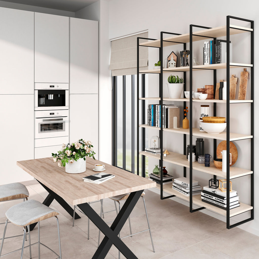Ils sont disponibles en trois hauteurs : 830, 1150 et 1790, tous avec une largeur de 350 mm permettant une grande capacité de stockage. Ils sont fabriqués avec un tube en acier très résistant de 25x10 mm, avec des plaques qui servent de barre transversale pour placer les étagères. Toute la structure est laquée dans une finition noire avec une grande attention aux détails.