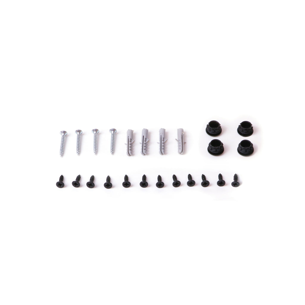 Tous les accessoires de montage sont inclus : 2 structures, vis et chevilles (Ø6x30) pour fixer la structure au mur, vis Ø3,5x15 finition noire pour fixer les étagères en bois à la structure, capuchons en plastique pour masquer la fixation de l'étagère au mur. Les niveleurs sont également inclus dans le cas des deux structures les plus hautes.