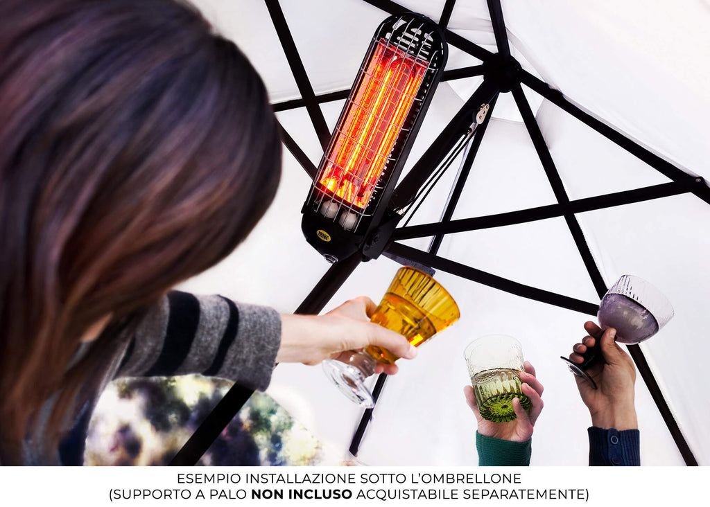 Lucciola est un radiateur infrarouge unique, compact, léger et polyvalent. Lucciola est la seule lampe conçue pour être installée directement sous des parasols ou des poteaux (support NON INCLUS) et au mur (support inclus).