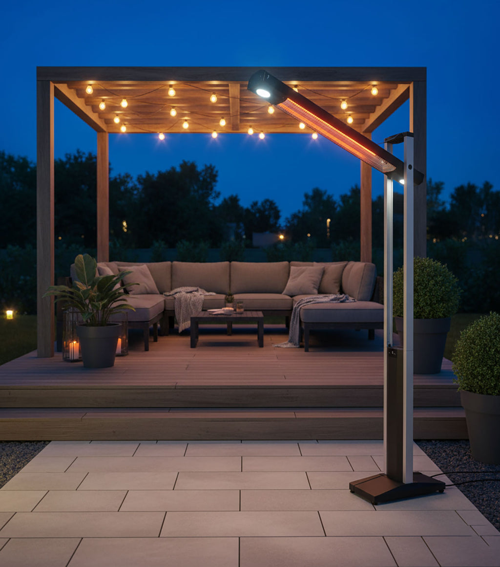 - Controllo manuale o con telecomando di 5 gradi di potenza riscaldante e 2x 3 W Led ( luce superiore)