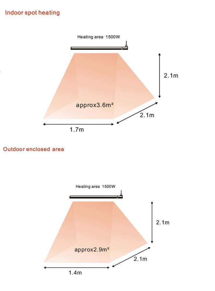Chauffage électrique infrarouge extérieur série A7 IR-C sans émission de lumière. Élément chauffant en alliage d'aluminium extrudé avec peinture céramique infrarouge. Support en acier inoxydable inclus, adapté au montage au plafond et au mur. Preuve de l'eau : IP65, adapté à la poussière et à la pluie en extérieur. Meilleures performances dans les zones extérieures ou intérieures très abritées et sans vent, telles que les vérandas.