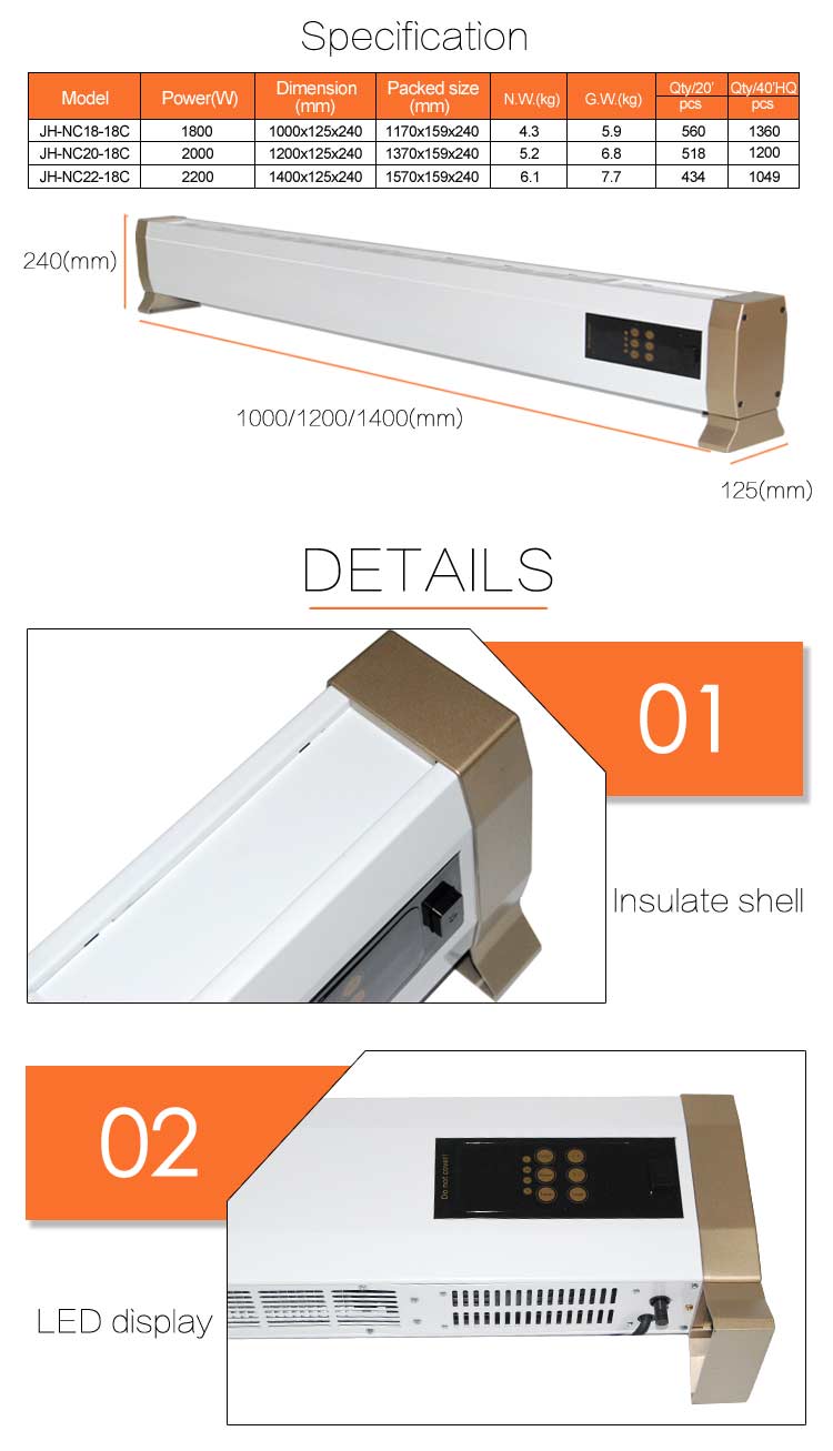 Poêle pratique pour sols et plinthes d'une puissance de 1800W, largement suffisant pour chauffer des pièces jusqu'à 15 m2. Design moderne et élégant qui convient aussi bien à un usage privé que public.