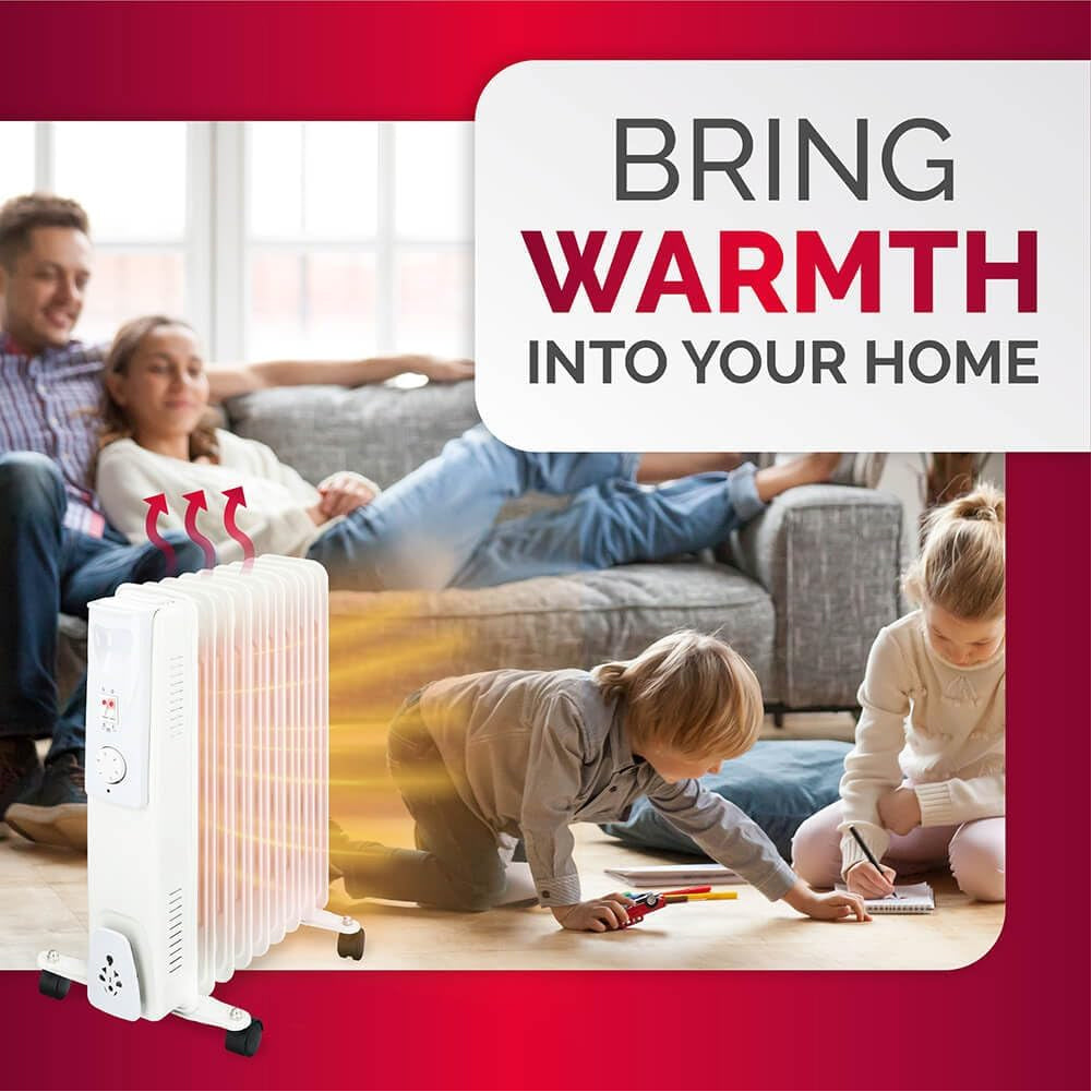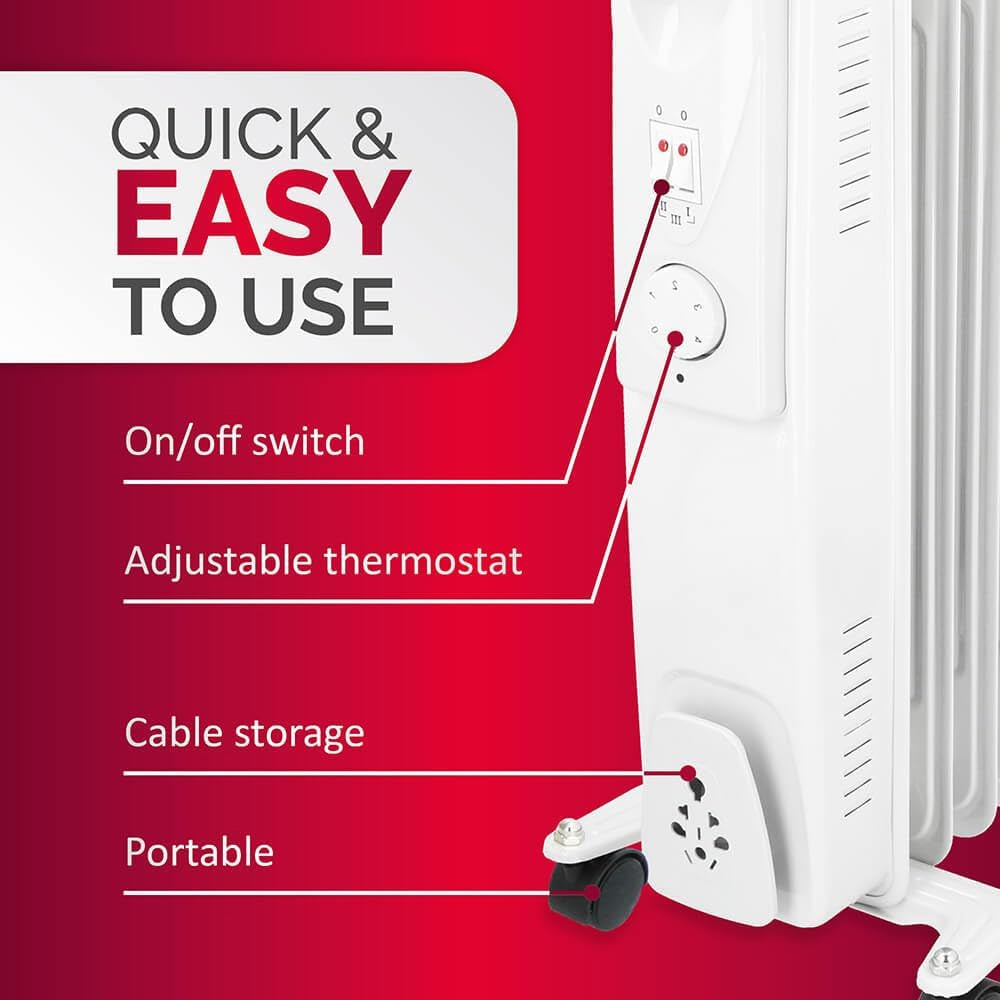 Dotato di arresto di sicurezza contro il surriscaldamento, custodia cavo, manico a scomparsa e 4 ruote per spostare il radiatore da una stanza all'altra senza il minimo sforzo.