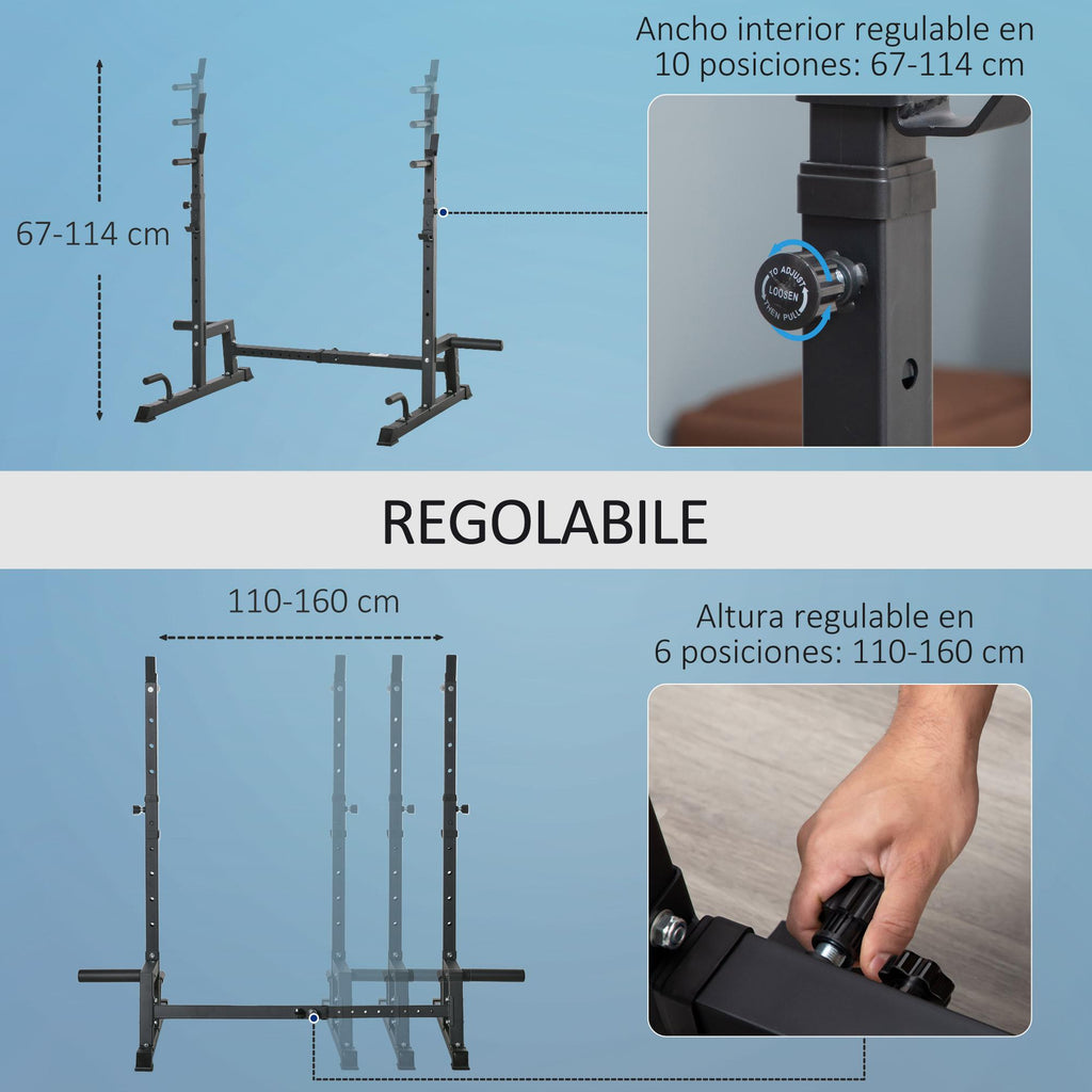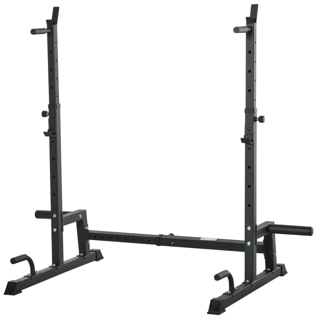 Entraînez-vous confortablement dans votre salle de sport personnelle avec des équipements de haute qualité comme ce support d'haltères multifonctionnel de . Fabriqué en acier solide pour durer longtemps, il est réglable en 10 positions pour s'adapter à chaque athlète. La largeur de la base peut être ajustée pour répondre au mieux aux différents besoins d'entraînement. Les pieds antidérapants assurent une plus grande stabilité et protègent le sol des rayures. Parfait pour faire des squats d'haltères à la maison.