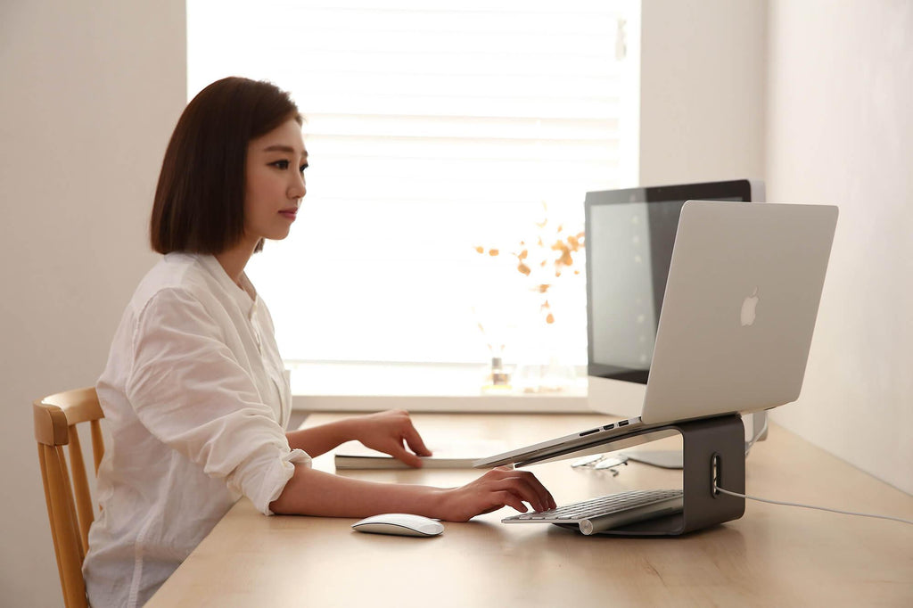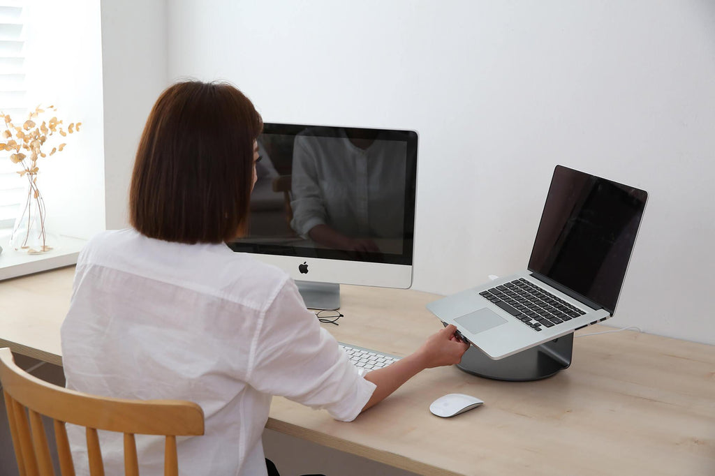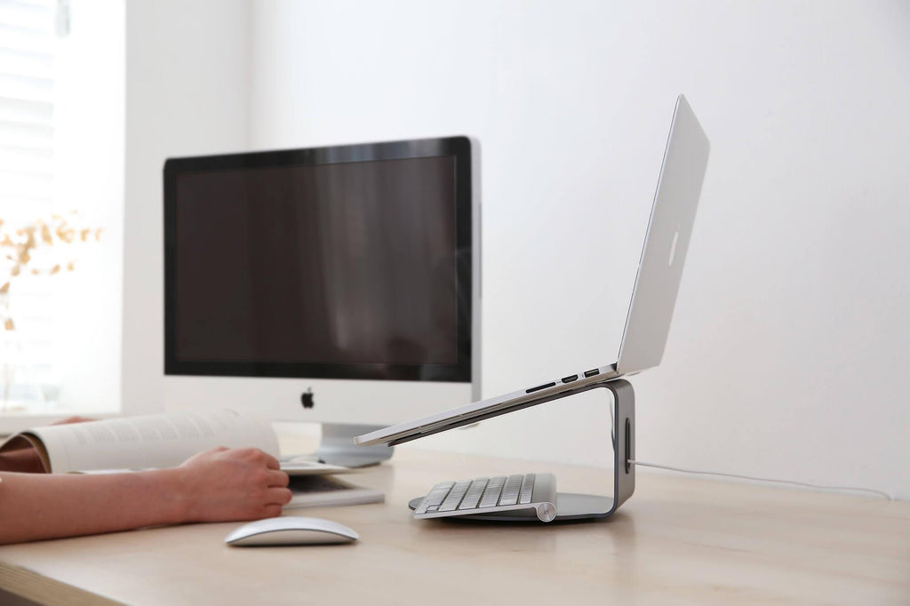 Il surélève l'ordinateur portable garantissant le bon angle de vision, un confort de frappe maximal et une posture correcte du dos. Les éléments en caoutchouc antidérapants garantissent une stabilité maximale. La base rotative à 360° facilite le partage d'écran. Le passe-câbles et l'espace en dessous permettent de libérer de l'espace supplémentaire sur le plan de travail qui est plus rangé et organisé. La structure en aluminium favorise la dissipation de la chaleur et évite la surchauffe de l'ordinateur portable. Compatible avec n'importe quel ordinateur portable jusqu'à 173.