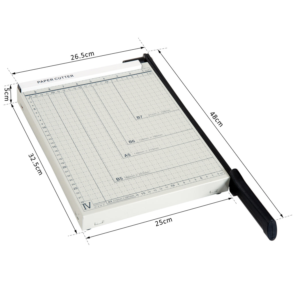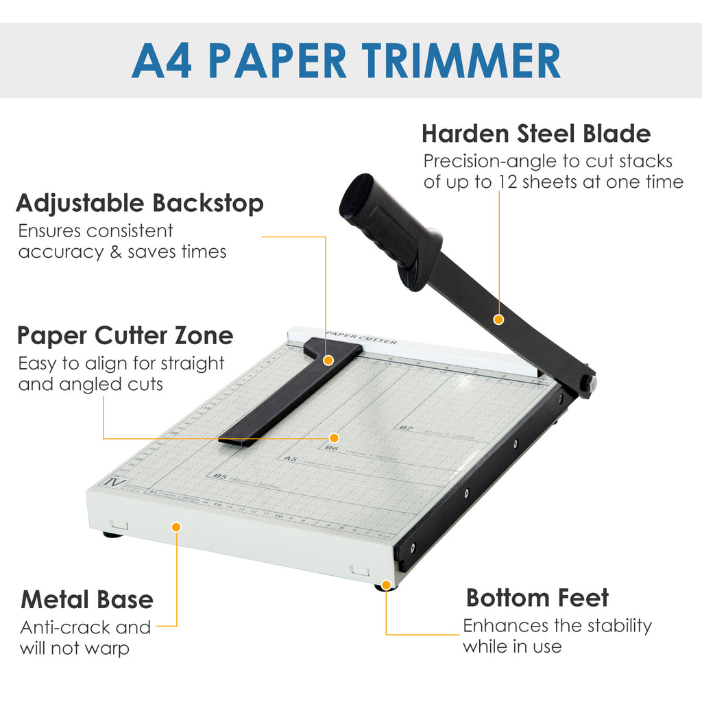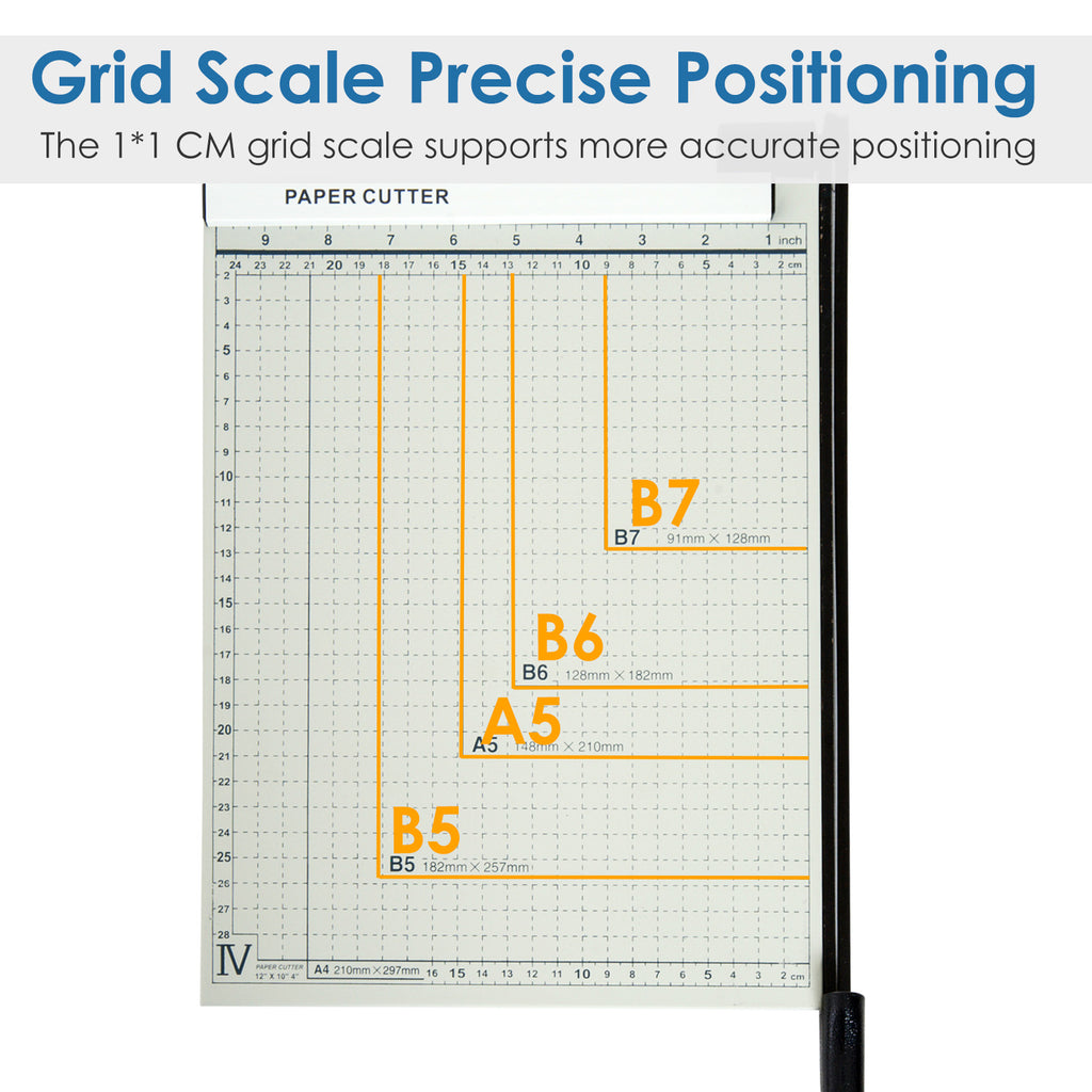 - FORMATI DISPONIBILI: Taglierina per carta A4 perfettamente rifinita per tagliare documenti, foto o altri materiali nel formato richiesto A4, B5, A5, B6, B7. Il prodotto taglia fino a 12 fogli di carta alla volta