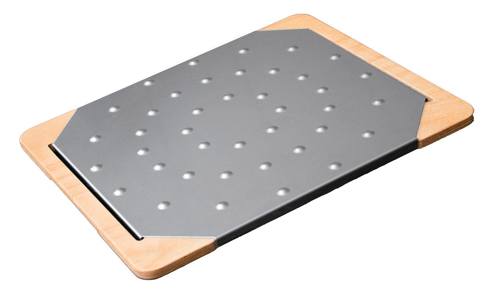 Tagliere "Giusto" per servire pizze e focacce. Supporto in legno e superficie in acciaio inox bugnata removibile e lavabile in lavastoviglie.